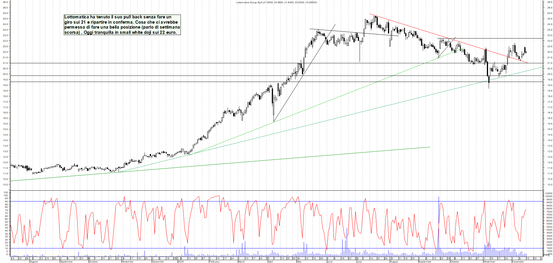 LOTTOMATICA: Lottomatica ha tenuto il suo pull back senza fare un giro sui 21 e ripartire in conferma. Cosa che ci avrebbe permesso di fare una bella posizione (parlo di settimana scorsa) . Oggi tranquilla in small white doji sui 22 euro.