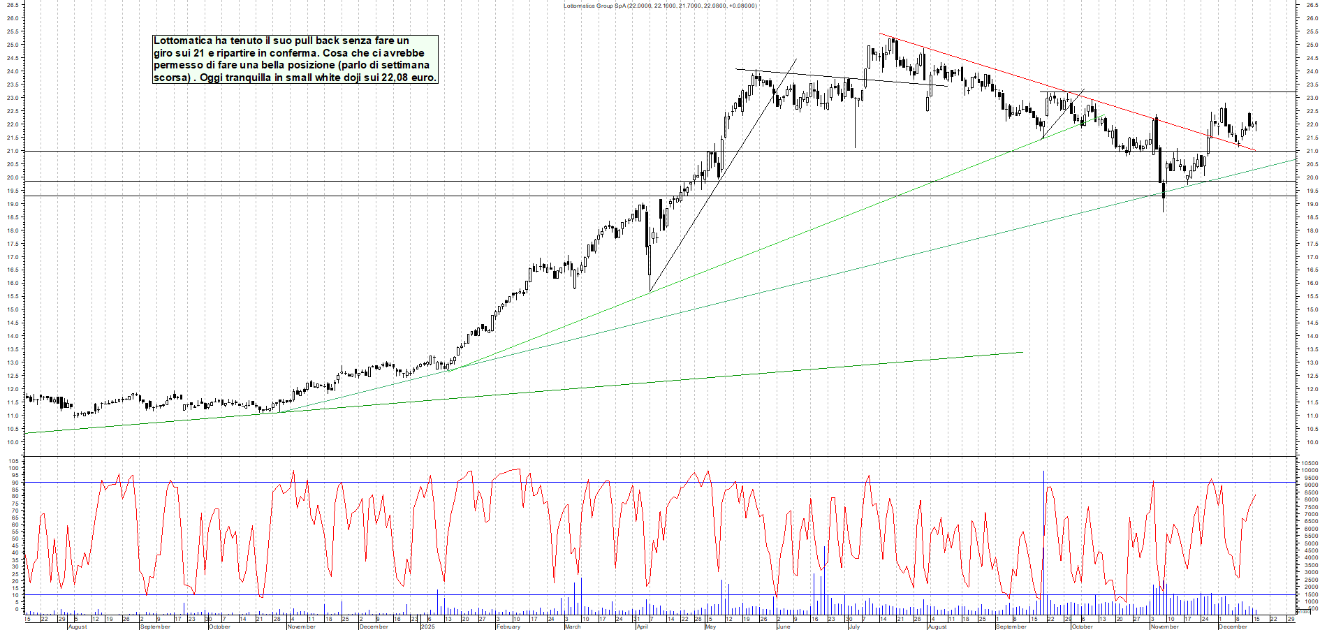 LOTTOMATICA: Lottomatica ha tenuto il suo pull back senza fare un giro sui 21 e ripartire in conferma. Cosa che ci avrebbe permesso di fare una bella posizione (parlo di settimana scorsa) . Oggi tranquilla in small white doji sui 22,08 euro.