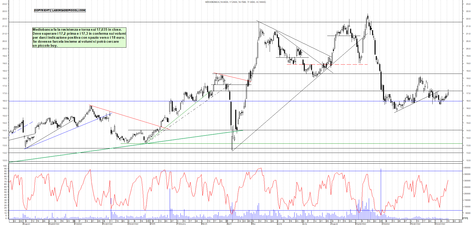 MEDIOBANCA: Mediobanca fa la resistenza e torna sui 17,035 in close. Deve superare i 17,2 prima e i 17,3 in conferma sui volumi per darci indicazione positiva con spazio verso i 18 euro. Se dovesse farcela insieme ai volumi si potrà cercare un piccolo buy.