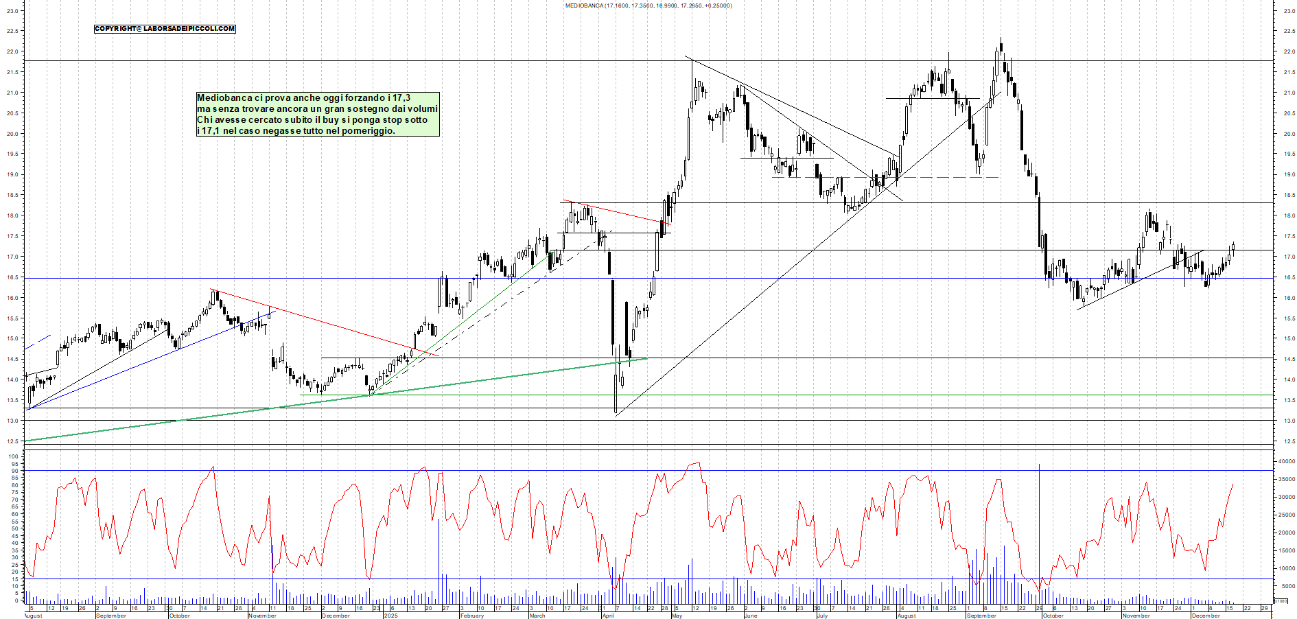MEDIOBANCA: Mediobanca ci prova anche oggi forzando i 17,3 ma senza trovare ancora un gran sostegno dai volumi Chi avesse cercato subito il buy si ponga stop sotto i 17,1 nel caso negasse tutto nel pomeriggio.