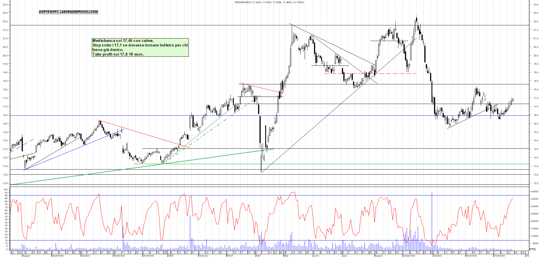 MEDIOBANCA: Mediobanca sui 17,46 con calma. Stop sotto i 17,1 se dovesse tornare indietro per chi fosse già dentro. Take profit sui 17,8-18 euro.