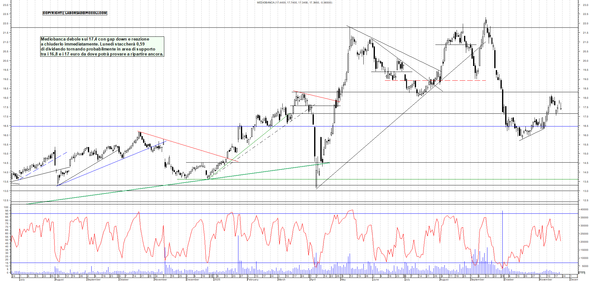 MEDIOBANCA: Mediobanca debole sui 17,4 con gap down e reazione a chiuderlo immediatamente. Lunedì staccherà 0,59 di dividendo tornando probabilmente in area di supporto tra i 16,8 e i 17 euro da dove potrà provare a ripartire ancora.