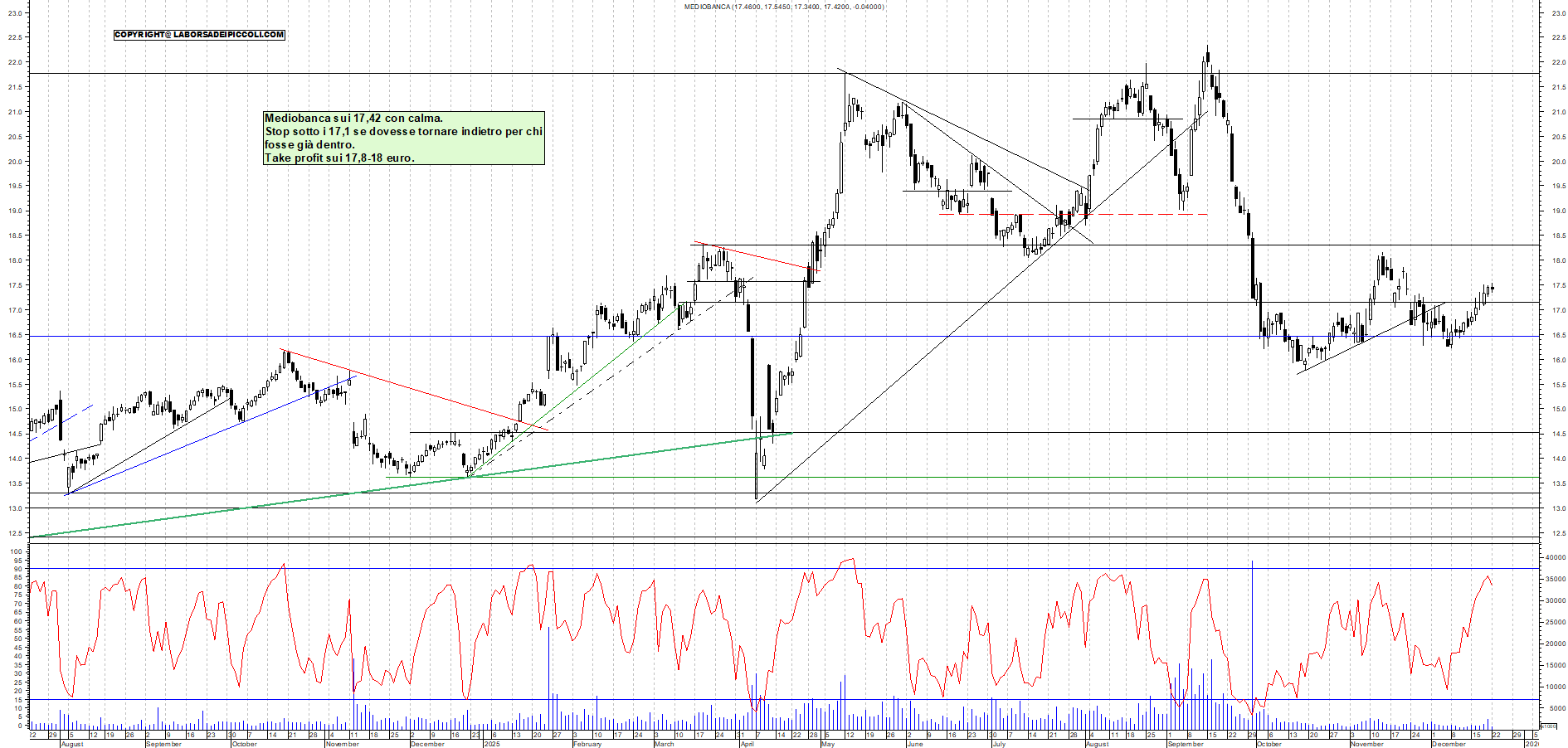 MEDIOBANCA: Mediobanca sui 17,42 con calma. Stop sotto i 17,1 se dovesse tornare indietro per chi fosse già dentro. Take profit sui 17,8-18 euro.