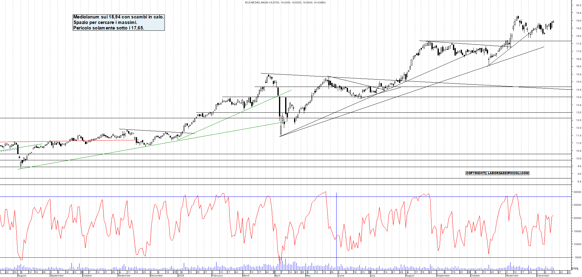 MEDIOLANUM: Mediolanum sui 18,94 con scambi in calo. Spazio per cercare i massimi. Pericolo solamente sotto i 17,65.