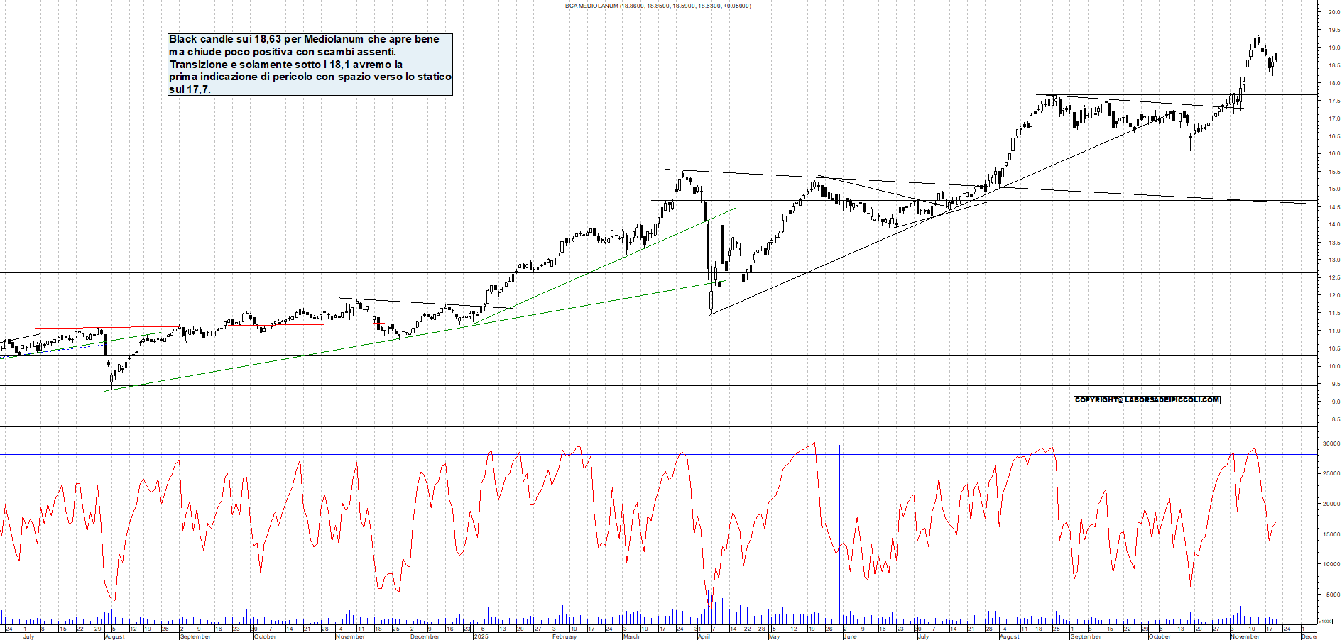 MEDIOLANUM: Black candle sui 18,63 per Mediolanum che apre bene ma chiude poco positiva con scambi assenti. Transizione e solamente sotto i 18,1 avremo la prima indicazione di pericolo con spazio verso lo statico sui 17,7.