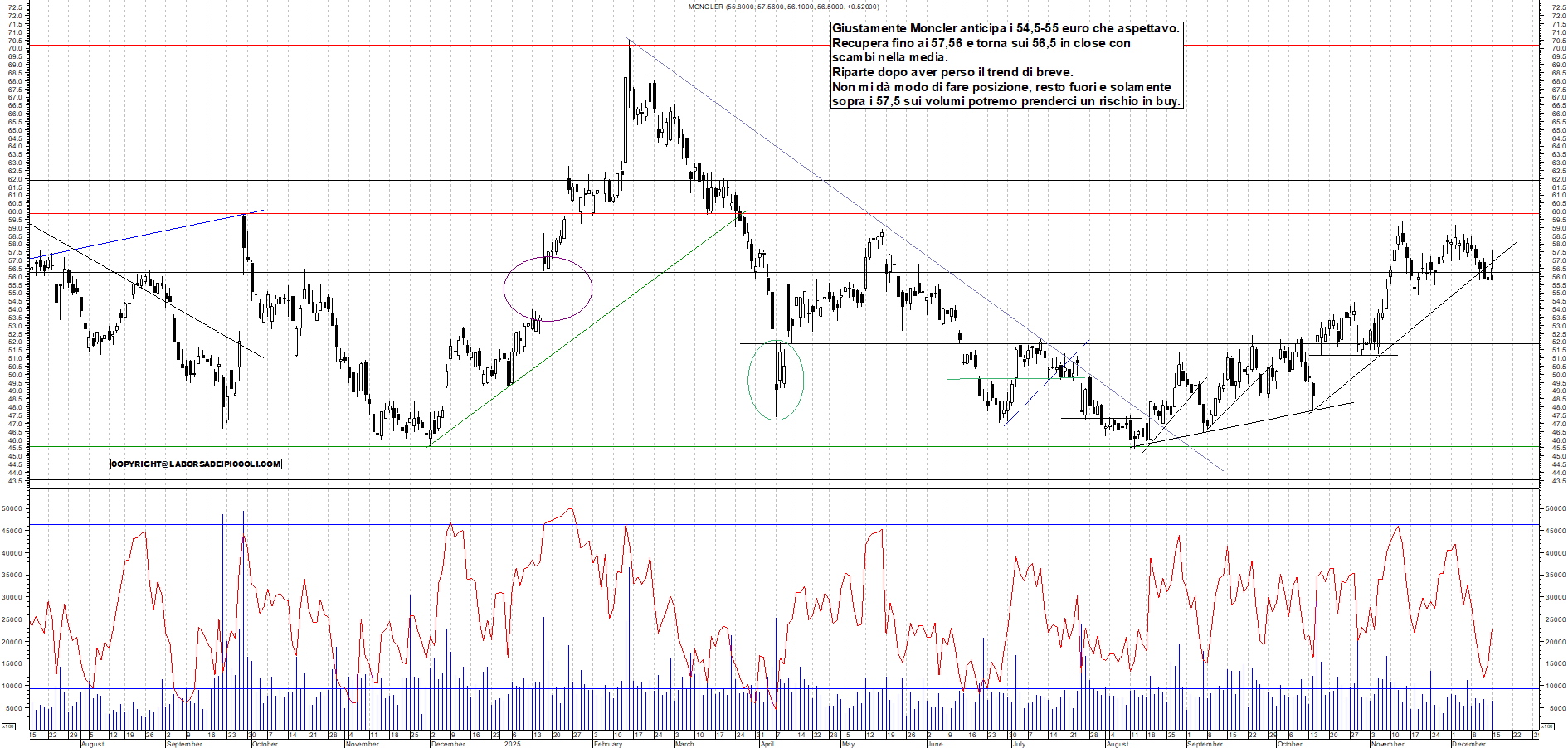 MONCLER: Giustamente Moncler anticipa i 54,5-55 euro che aspettavo. Recupera fino ai 57,56 e torna sui 56,5 in close con scambi nella media. Riparte dopo aver perso il trend di breve. Non mi dà modo di fare posizione, resto fuori e solamente sopra i 57,5 sui volumi potremo prenderci un rischio in buy.