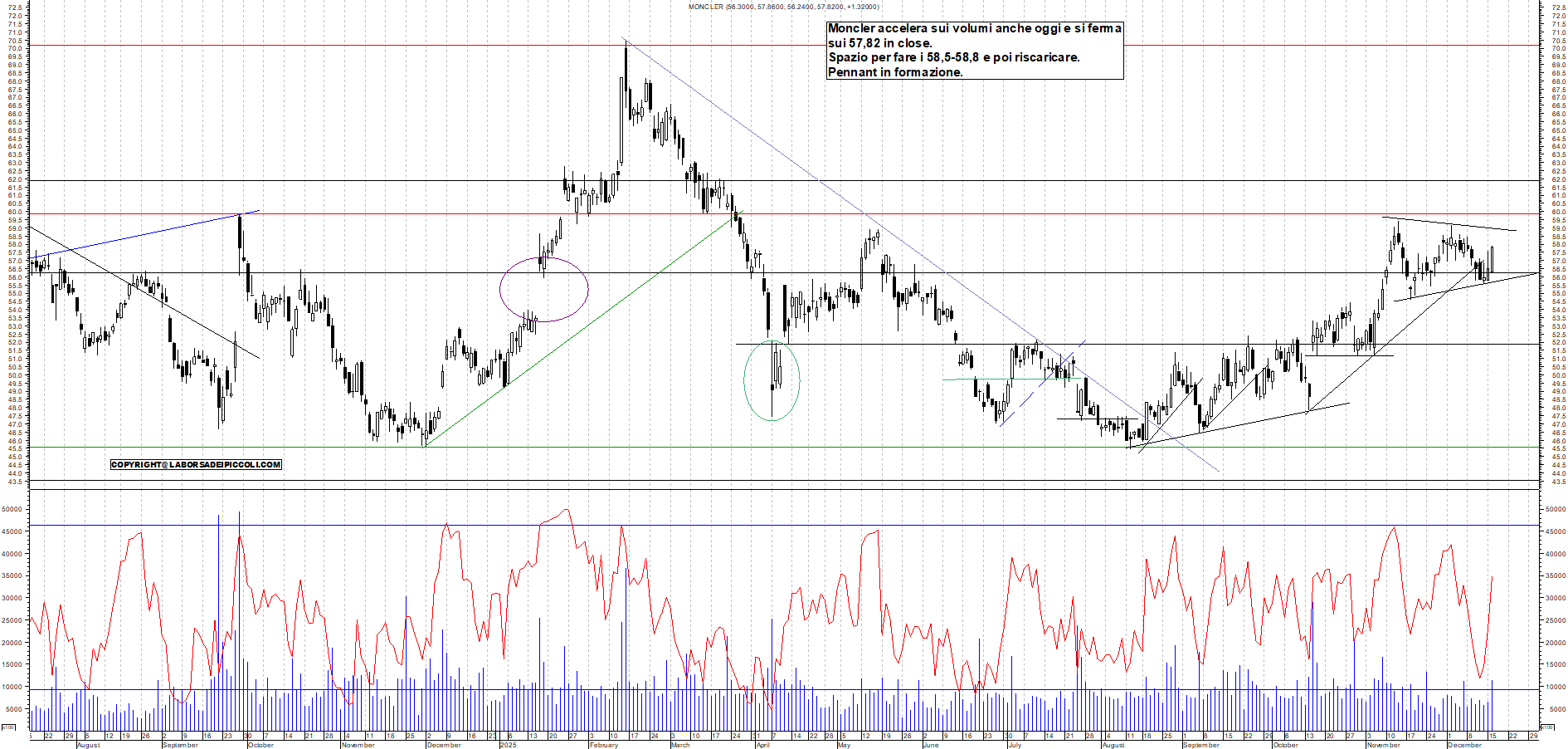 MONCLER: Moncler accelera sui volumi anche oggi e si ferma sui 57,82 in close. Spazio per fare i 58,5-58,8 e poi riscaricare. Pennant in formazione.