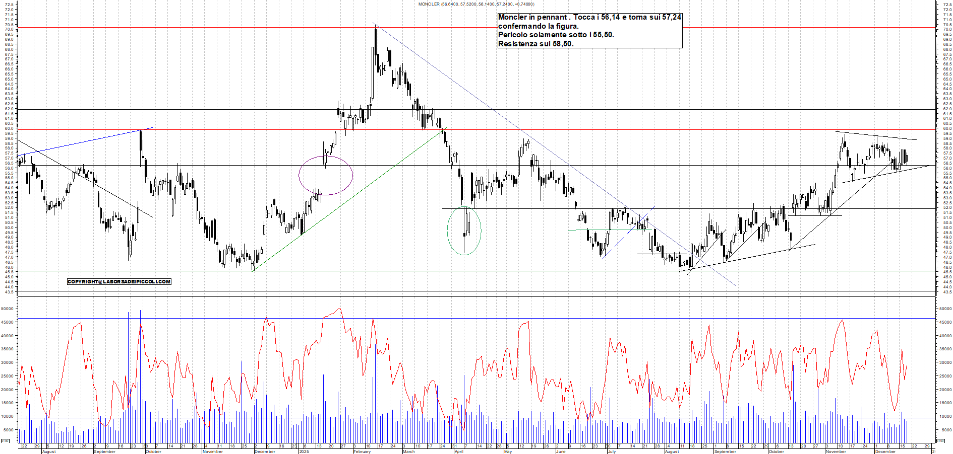 MONCLER: Moncler in pennant . Tocca i 56,14 e torna sui 57,24 confermando la figura. Pericolo solamente sotto i 55,50. Resistenza sui 58,50.