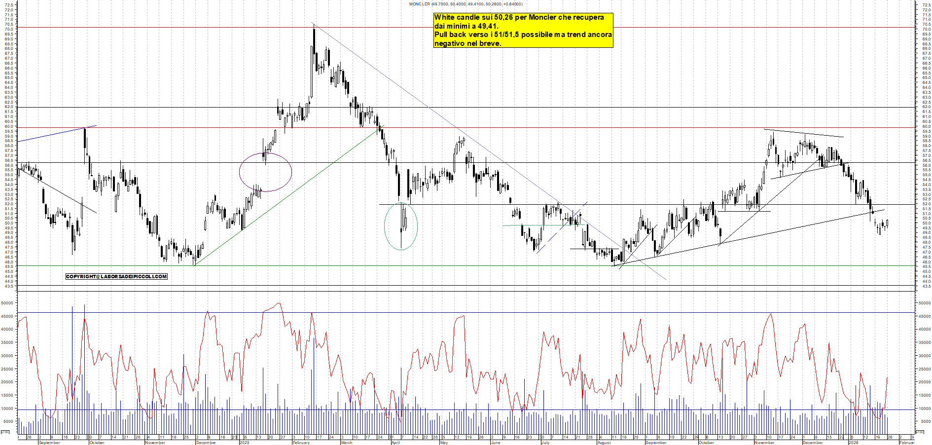 MONCLER: White candle sui 50,26 per Moncler che recupera dai minimi a 49,41. Pull back verso i 51/51,5 possibile ma trend ancora negativo nel breve.