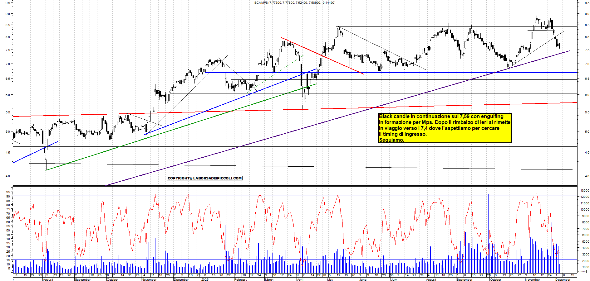 MPS: Black candle in continuazione sui 7,59 con engulfing in formazione per Mps. Dopo il rimbalzo di ieri si rimette in viaggio verso i 7,4 dove l'aspettiamo per cercare il timing di ingresso. Seguiamo.