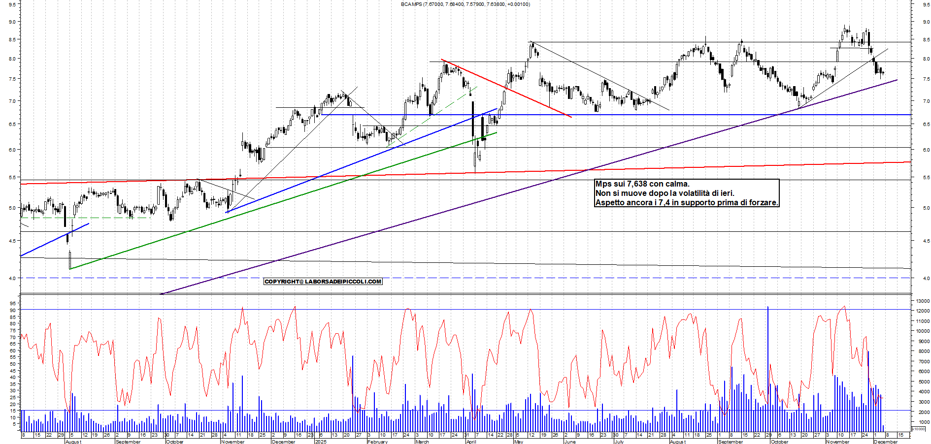 MPS: Mps sui 7,638 con calma. Non si muove dopo la volatilità di ieri. Aspetto ancora i 7,4 in supporto prima di forzare.