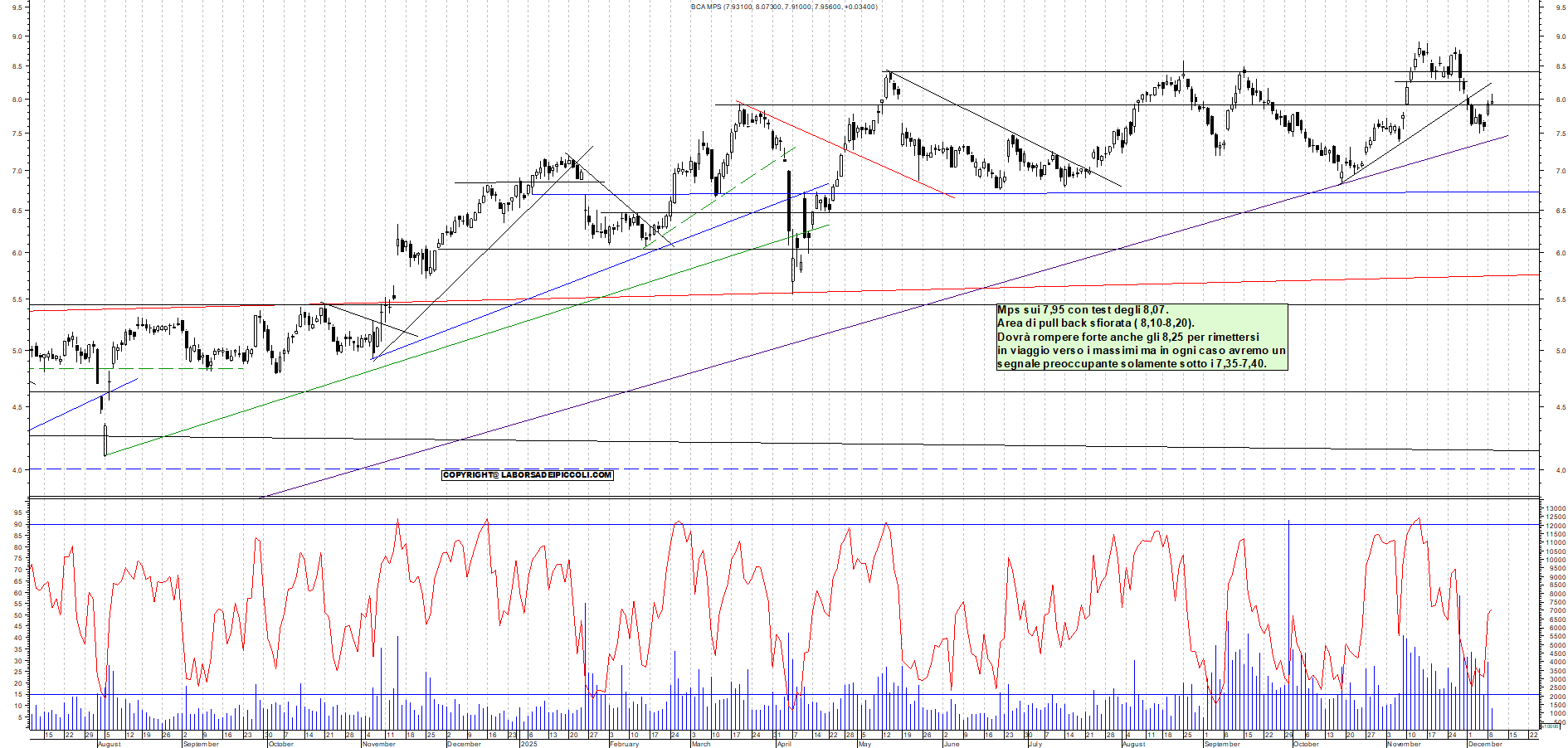 MPS: Mps sui 7,95 con test degli 8,07. Area di pull back sfiorata ( 8,10-8,20). Dovrà rompere forte anche gli 8,25 per rimettersi in viaggio verso i massimi ma in ogni caso avremo un segnale preoccupante solamente sotto i 7,35-7,40.