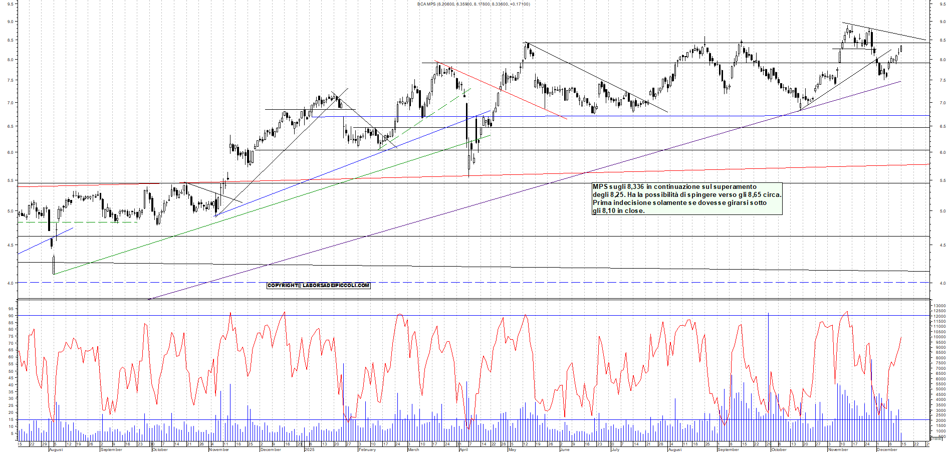 MPS: MPS sugli 8,336 in continuazione sul superamento degli 8,25. Ha la possibilità di spingere verso gli 8,65 circa. Prima indecisione solamente se dovesse girarsi sotto gli 8,10 in close.