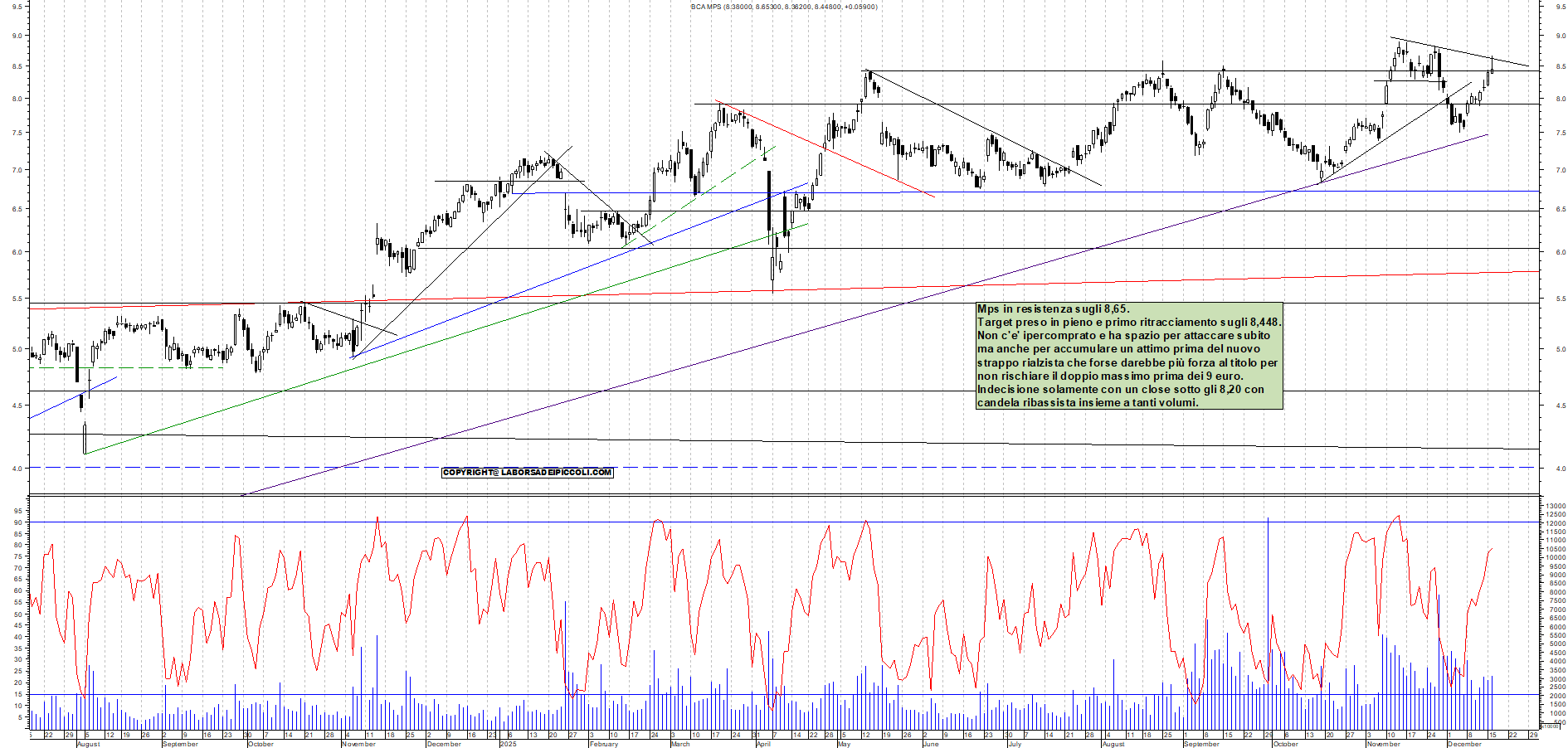 MPS: Mps in resistenza sugli 8,65. Target preso in pieno e primo ritracciamento sugli 8,448. Non c'e' ipercomprato e ha spazio per attaccare subito ma anche per accumulare un attimo prima del nuovo strappo rialzista che forse darebbe più forza al titolo per non rischiare il doppio massimo prima dei 9 euro. Indecisione solamente con un close sotto gli 8,10 con candela ribassista insieme a tanti volumi.