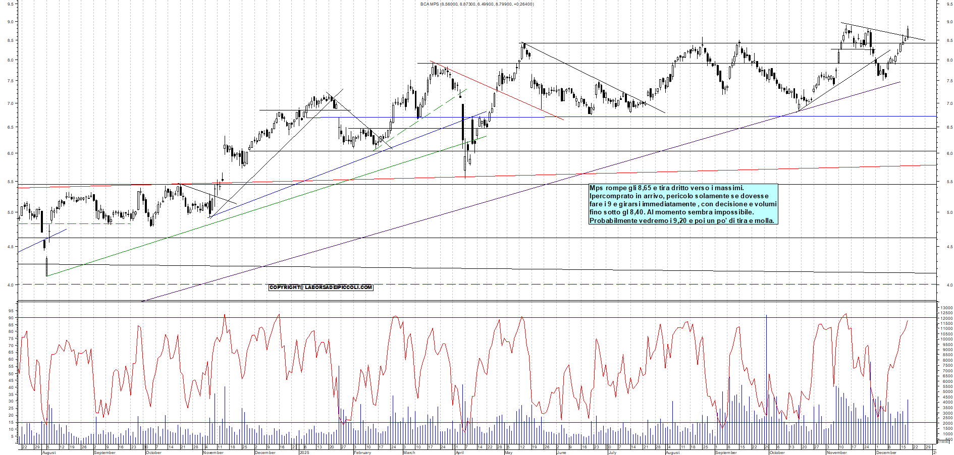 MPS: Mps rompe gli 8,65 e tira dritto verso i massimi. Ipercomprato in arrivo, pericolo solamente se dovesse fare i 9 e girarsi immediatamente , con decisione e volumi fino sotto gl 8,40. Al momento sembra impossibile. Probabilmente vedremo i 9,20 e poi un po' di tira e molla.