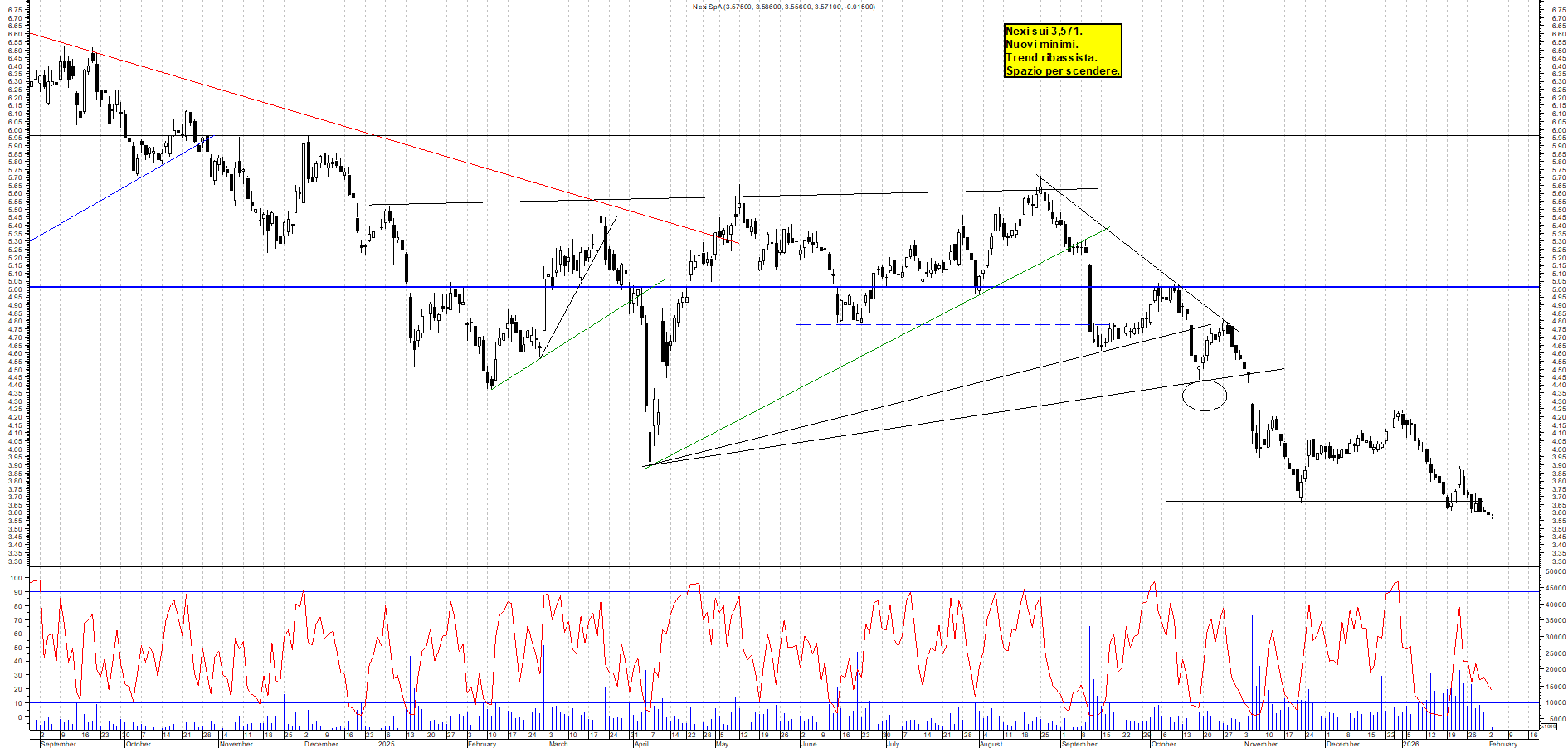 NEXI: Nexi sui 3,571. Nuovi minimi. Trend ribassista. Spazio per scendere.