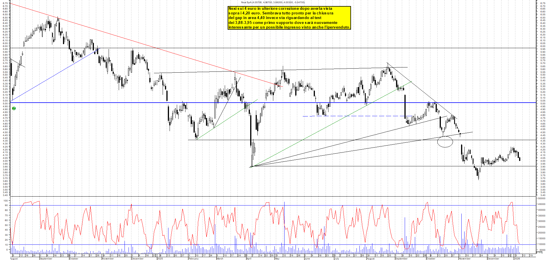 NEXI: Nexi sui 4 euro in ulteriore correzione dopo averla vista sopra i 4,20 euro. Sembrava tutto pronto per la chiusura del gap in area 4,40 invece sta riguardando al test dei 3,88-3,95 come primo supporto dove sarà nuovamente interessante per un possibile ingresso visto anche l'ipervenduto.