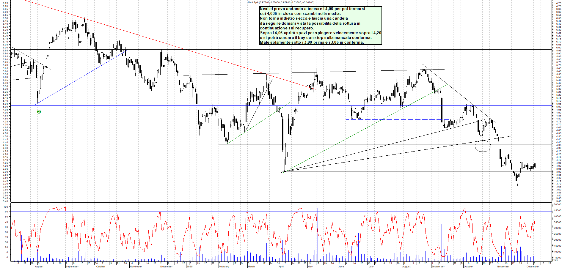 NEXI: Nexi ci prova andando a toccare i 4,06 per poi fermarsi sui 4,036 in close con scambi nella media. Non torna indietro secca e lascia una candela da seguire domani vista la possibilità della rottura in continuazione sul recupero. Sopra i 4,06 aprirà spazi per spingere velocemente sopra i 4,20 e si potrà cercare il buy con stop sulla mancata conferma. Male solamente sotto i 3,90 prima e i 3,86 in conferma.