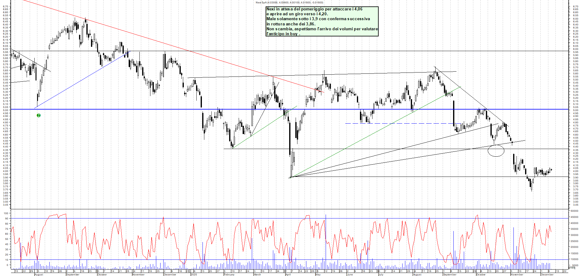 NEXI: Nexi in attesa del pomeriggio per attaccare i 4,06 e aprire ad un giro verso i 4,20. Male solamente sotto i 3,9 con conferma successiva in rottura anche dei 3,86. Non scambia, aspettiamo l'arrivo dei volumi per valutare l'anticipo in buy .