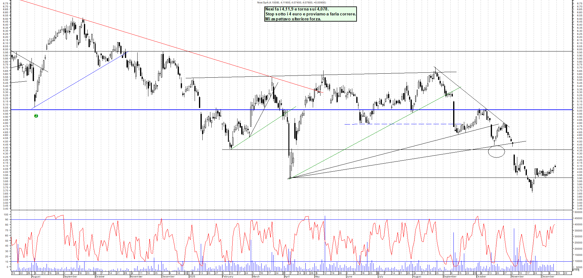 NEXI: Nexi fa i 4,11,9 e torna sui 4,078. Stop sotto i 4 euro e proviamo a farla correre. Mi aspettavo ulteriore forza.