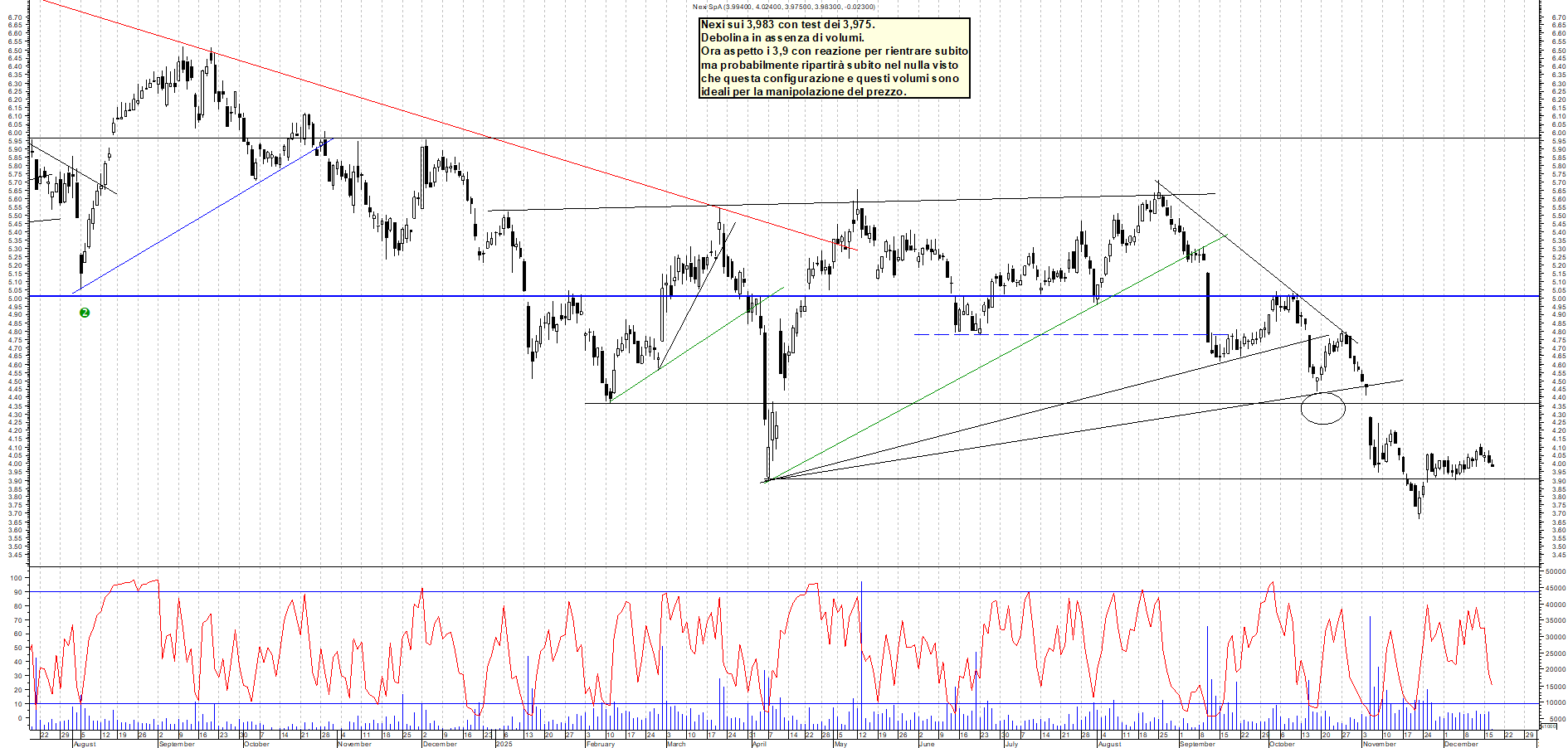 NEXI: Nexi sui 3,983 con test dei 3,975. Debolina in assenza di volumi. Ora aspetto i 3,9 con reazione per rientrare subito ma probabilmente ripartirà subito nel nulla visto che questa configurazione e questi volumi sono ideali per la manipolazione del prezzo.