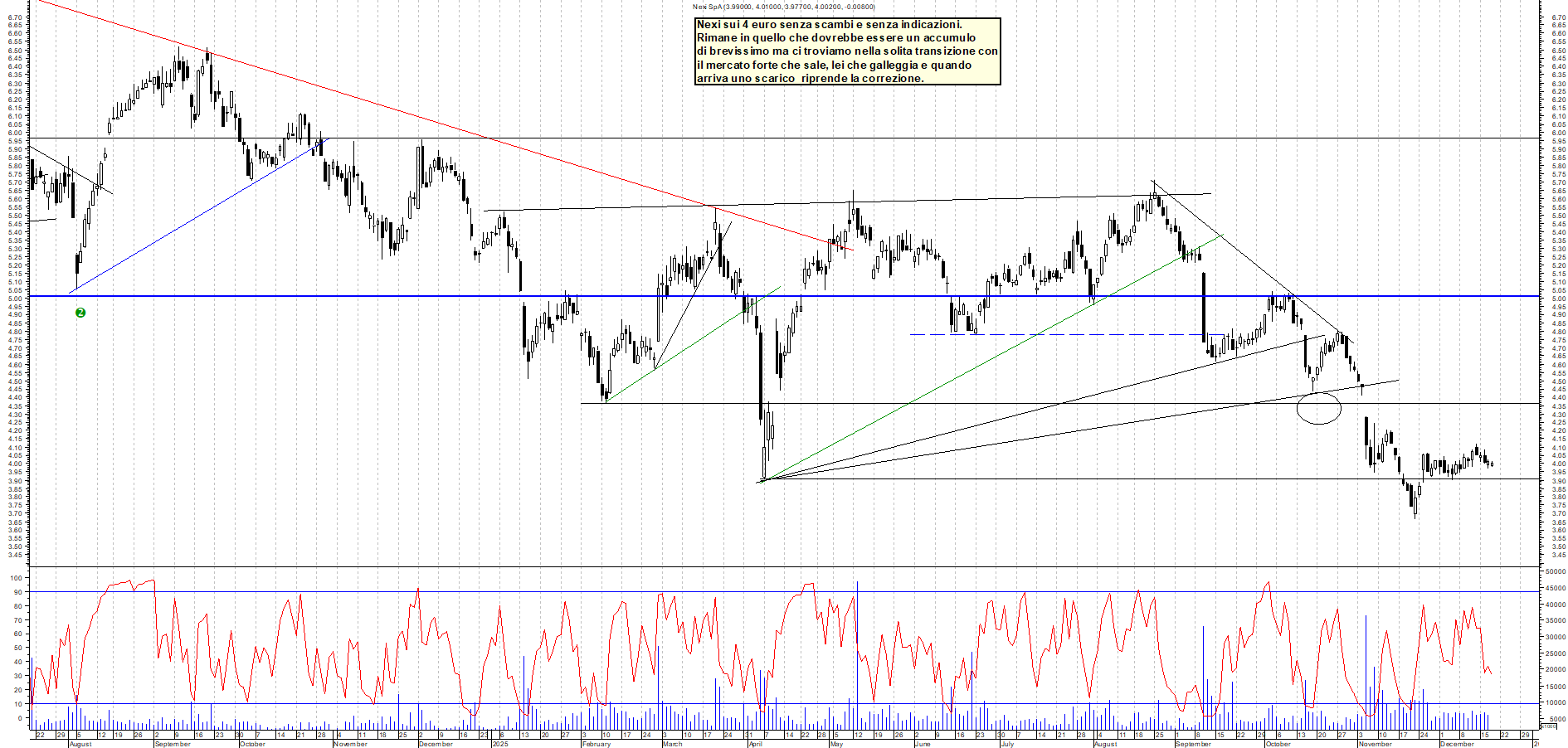 NEXI: Nexi sui 4 euro senza scambi e senza indicazioni. Rimane in quello che dovrebbe essere un accumulo di brevissimo ma ci troviamo nella solita transizione con il mercato forte che sale, lei che galleggia e quando arriva uno scarico riprende la correzione.