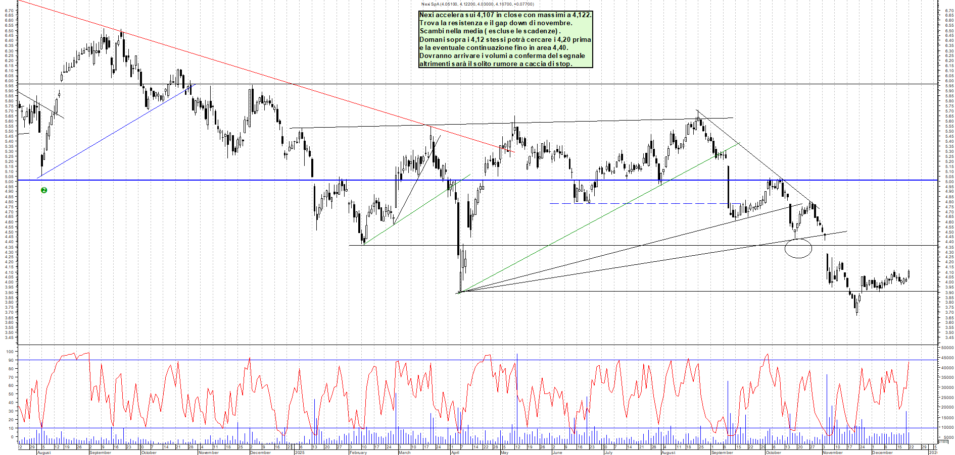 NEXI: Nexi accelera sui 4,107 in close con massimi a 4,122. Trova la resistenza e il gap down di novembre. Scambi nella media ( escluse le scadenze) . Domani sopra i 4,12 stessi potrà cercare i 4,20 prima e la eventuale continuazione fino in area 4,40. Dovranno arrivare i volumi a conferma del segnale altrimenti sarà il solito rumore a caccia di stop.