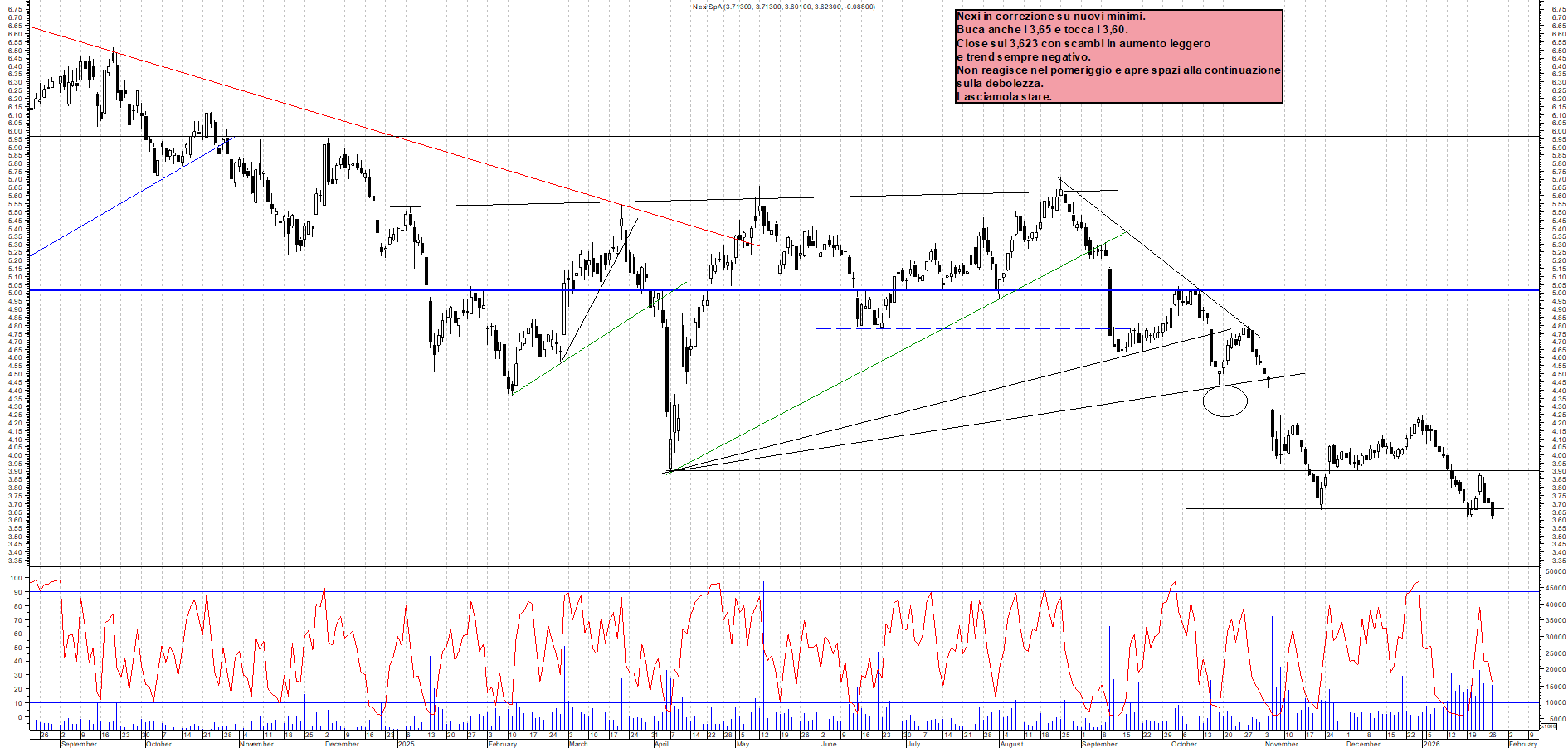 NEXI: Nexi in correzione su nuovi minimi. Buca anche i 3,65 e tocca i 3,60. Close sui 3,623 con scambi in aumento leggero e trend sempre negativo. Non reagisce nel pomeriggio e apre spazi alla continuazione sulla debolezza. Lasciamola stare.