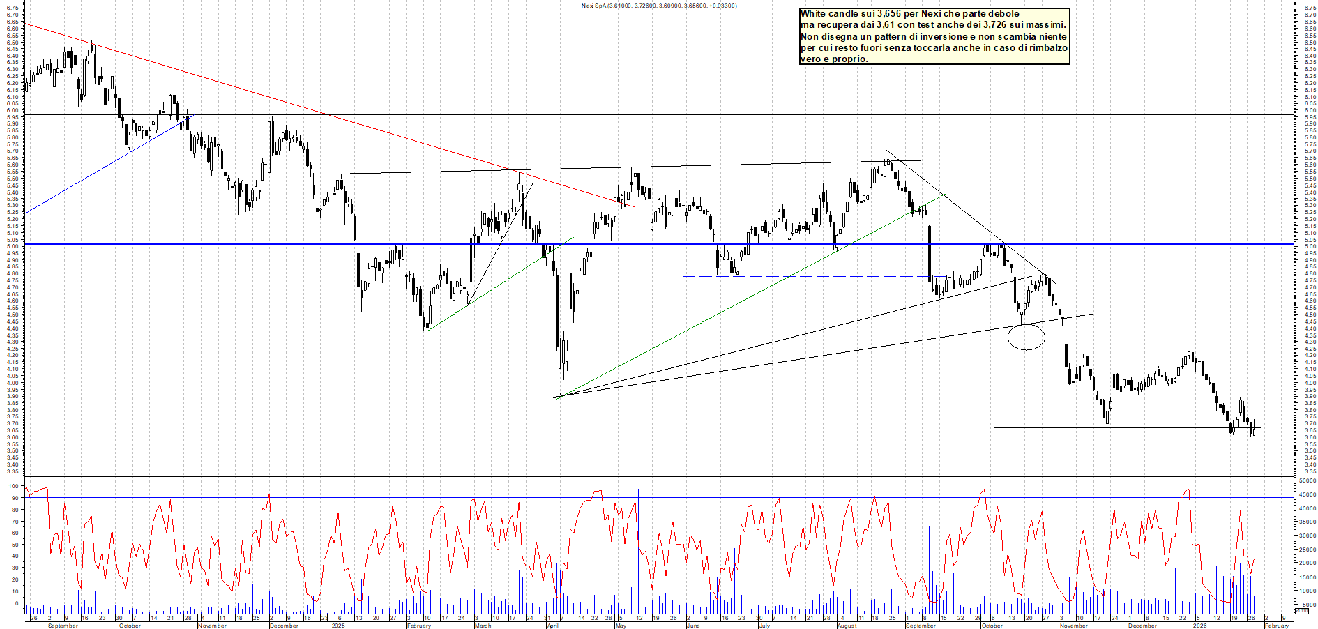 NEXI: White candle sui 3,656 per Nexi che parte debole ma recupera dai 3,61 con test anche dei 3,726 sui massimi. Non disegna un pattern di inversione e non scambia niente per cui resto fuori senza toccarla anche in caso di rimbalzo vero e proprio.📊 Livelli OperativiSupporti:Min€Resistenze:3,73€➔ Analisi completa NEXI con strategia operativa