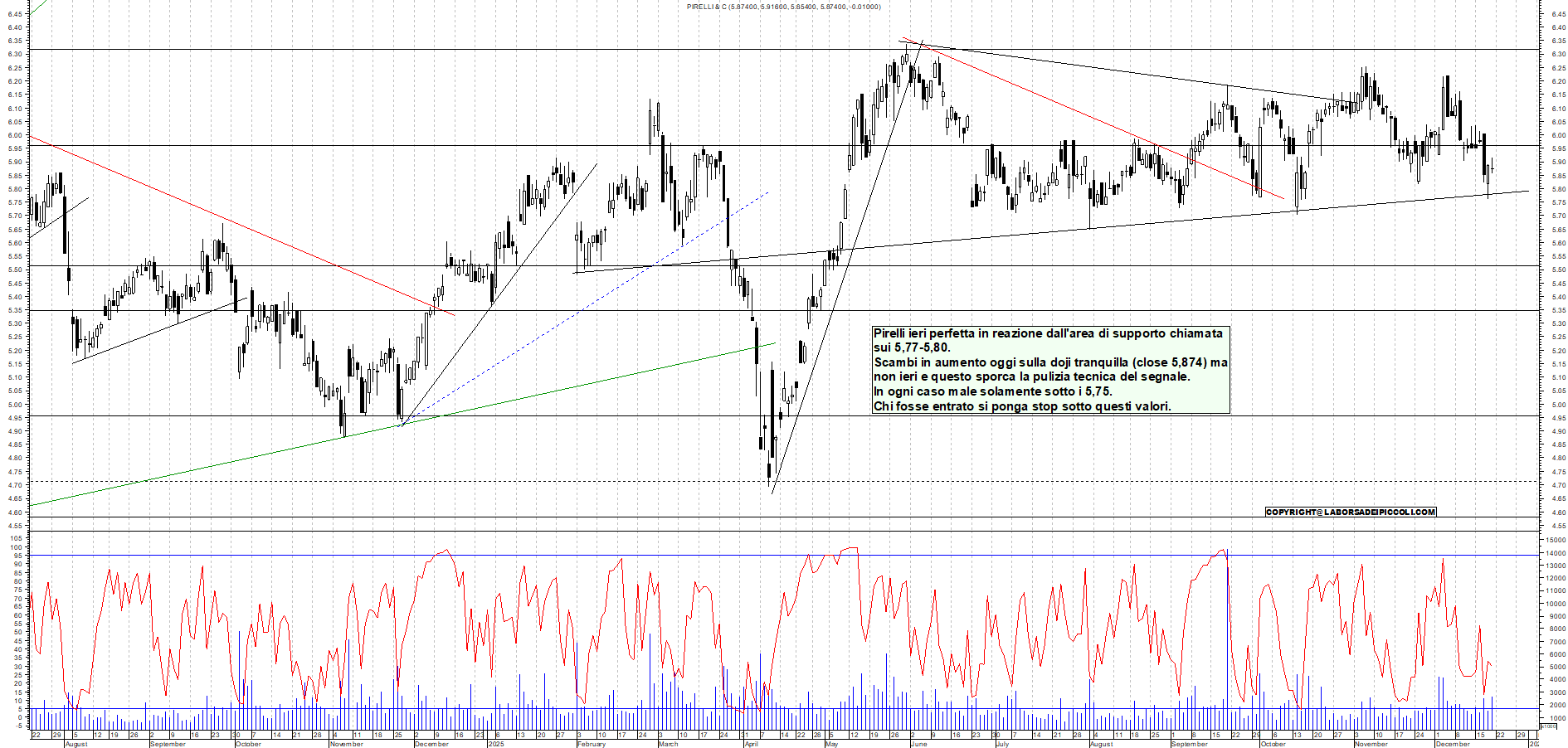 PIRELLI: Pirelli ieri perfetta in reazione dall'area di supporto chiamata sui 5,77-5,80. Scambi in aumento oggi sulla doji tranquilla (close 5,874) ma non ieri e questo sporca la pulizia tecnica del segnale. In ogni caso male solamente sotto i 5,75. Chi fosse entrato si ponga stop sotto questi valori.