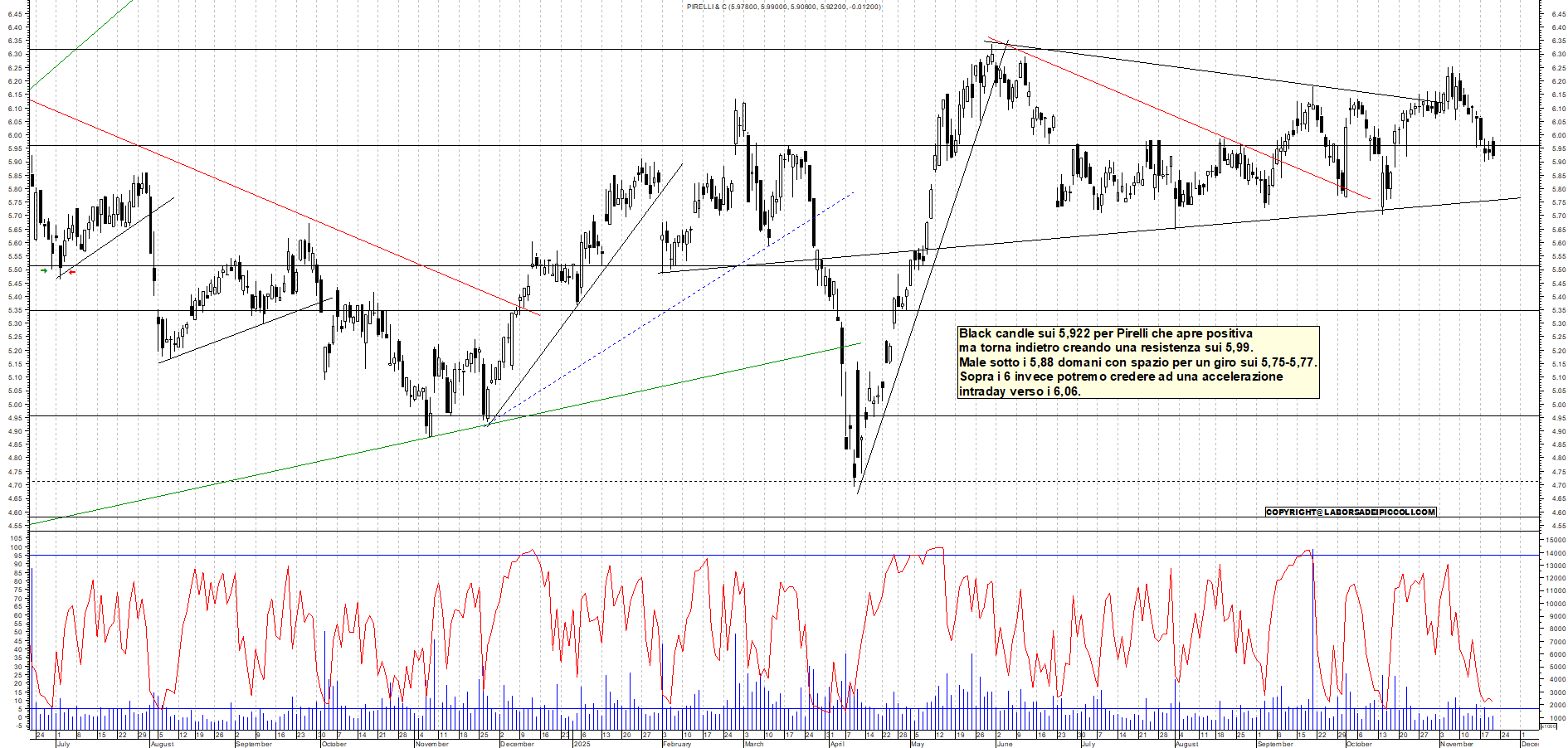 PIRELLI: Black candle sui 5,922 per Pirelli che apre positiva ma torna indietro creando una resistenza sui 5,99. Male sotto i 5,88 domani con spazio per un giro sui 5,75-5,77. Sopra i 6 invece potremo credere ad una accelerazione intraday verso i 6,06.