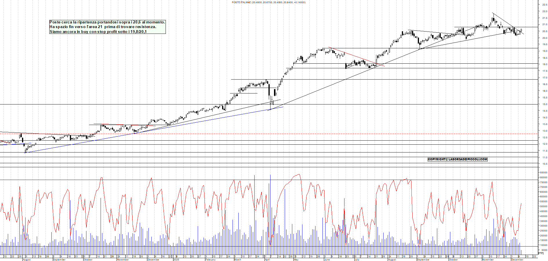 POSTE: Poste cerca la ripartenza portandosi sopra i 20,6 al momento. Ha spazio fin verso l'area 21 prima di trovare resistenza. Siamo ancora in buy con stop profit sotto i 19,8/20,1