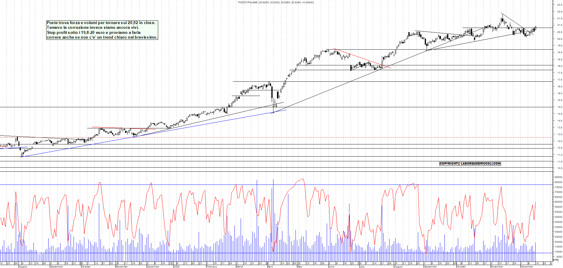 POSTE: Poste trova forza e volumi per tornare sui 20,92 in close. Temevo la correzione invece siamo ancora vivi. Stop profit sotto i 19,8-20 euro e proviamo a farla correre anche se non c'e' un trend chiaro nel brevissimo.