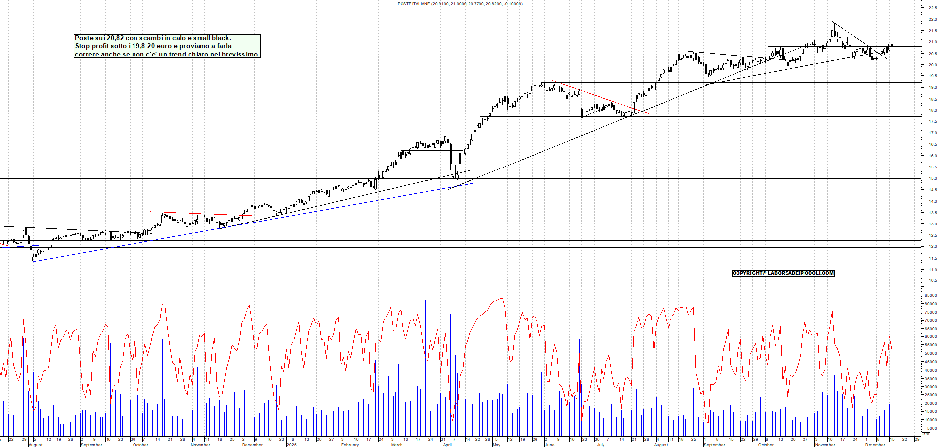 POSTE: Poste sui 20,82 con scambi in calo e small black. Stop profit sotto i 19,8-20 euro e proviamo a farla correre anche se non c'e' un trend chiaro nel brevissimo.