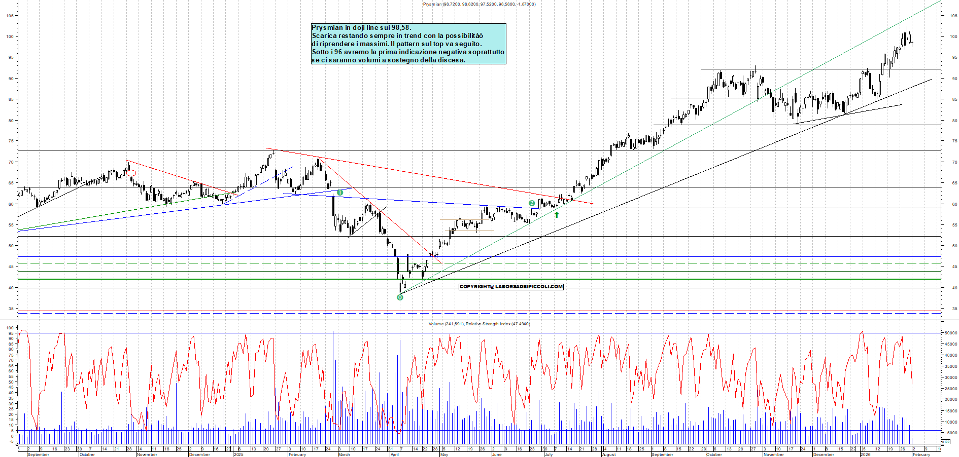 PRYSMIAN: Prysmian in doji line sui 98,58. Scarica restando sempre in trend con la possibilitàò di riprendere i massimi. Il pattern sul top va seguito. Sotto i 96 avremo la prima indicazione negativa soprattutto se ci saranno volumi a sostegno della discesa.