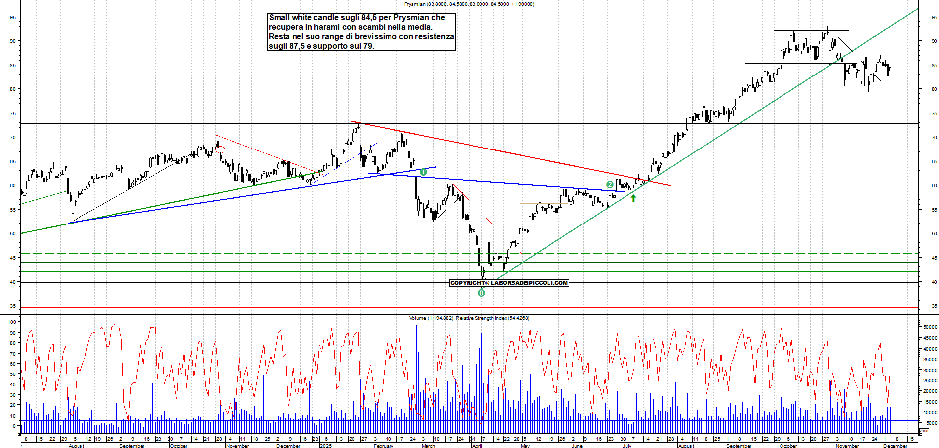 PRYSMIAN: Small white candle sugli 84,5 per Prysmian che recupera in harami con scambi nella media. Resta nel suo range di brevissimo con resistenza sugli 87,5 e supporto sui 79.