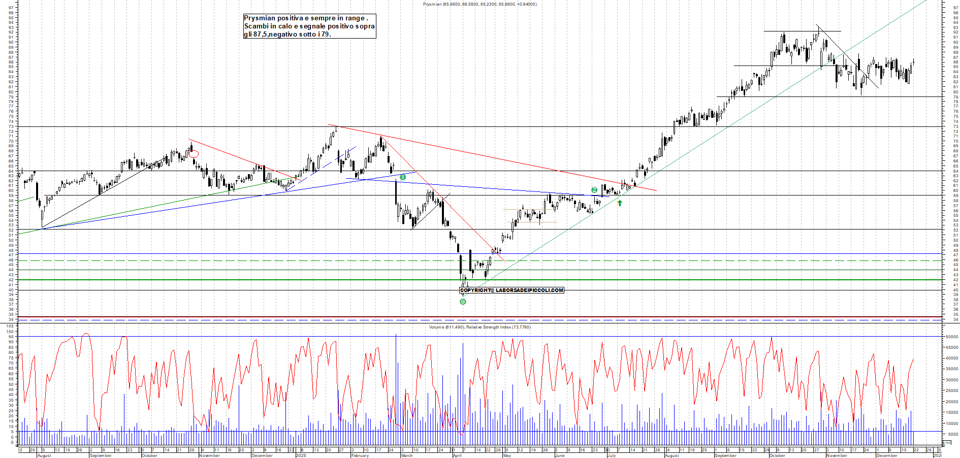 PRYSMIAN: Prysmian positiva e sempre in range . Scambi in calo e segnale positivo sopra gli 87,5,negativo sotto i 79.