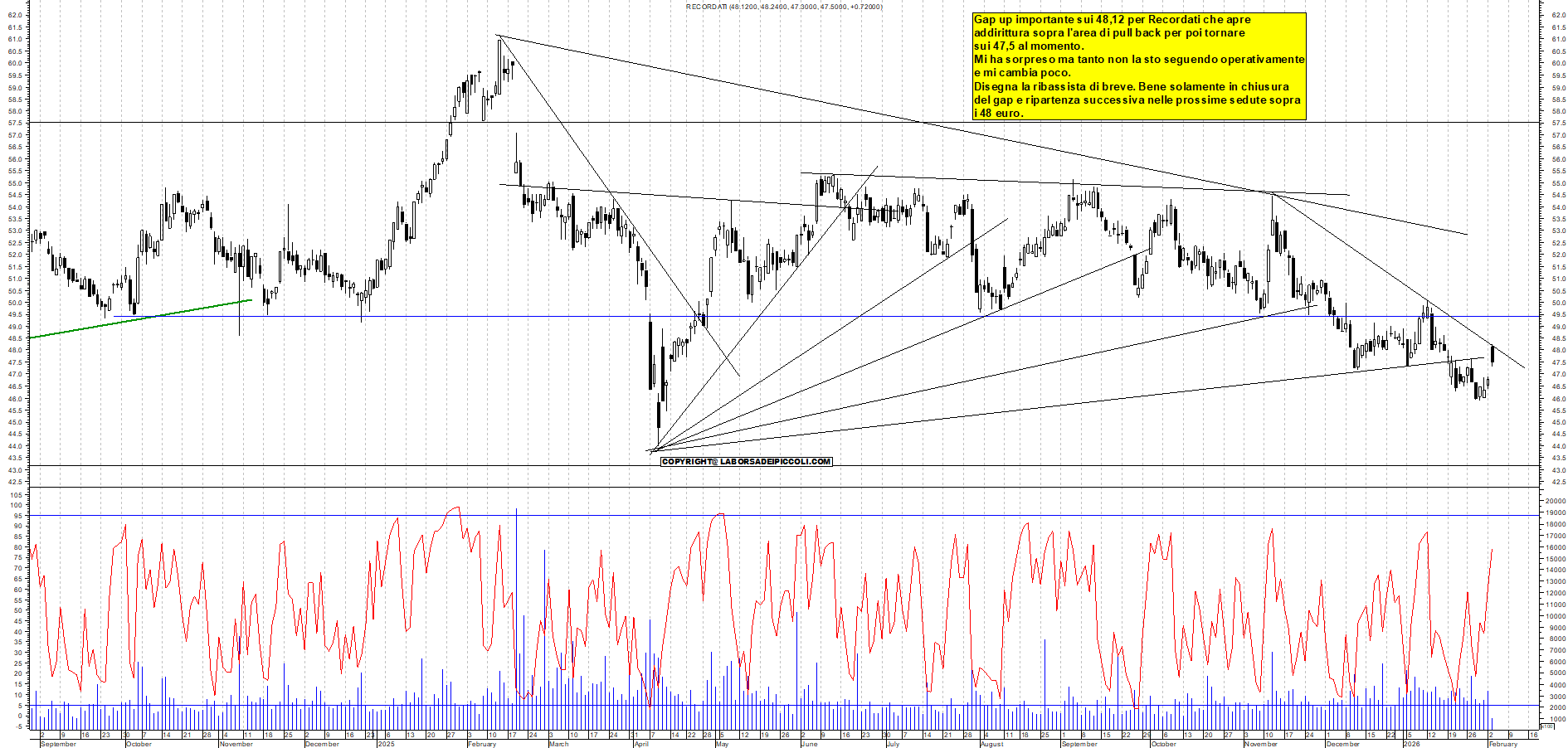 RECORDATI: Gap up importante sui 48,12 per Recordati che apre addirittura sopra l'area di pull back per poi tornare sui 47,5 al momento. Mi ha sorpreso ma tanto non la sto seguendo operativamente e mi cambia poco. Disegna la ribassista di breve. Bene solamente in chiusura del gap e ripartenza successiva nelle prossime sedute sopra i 48 euro.