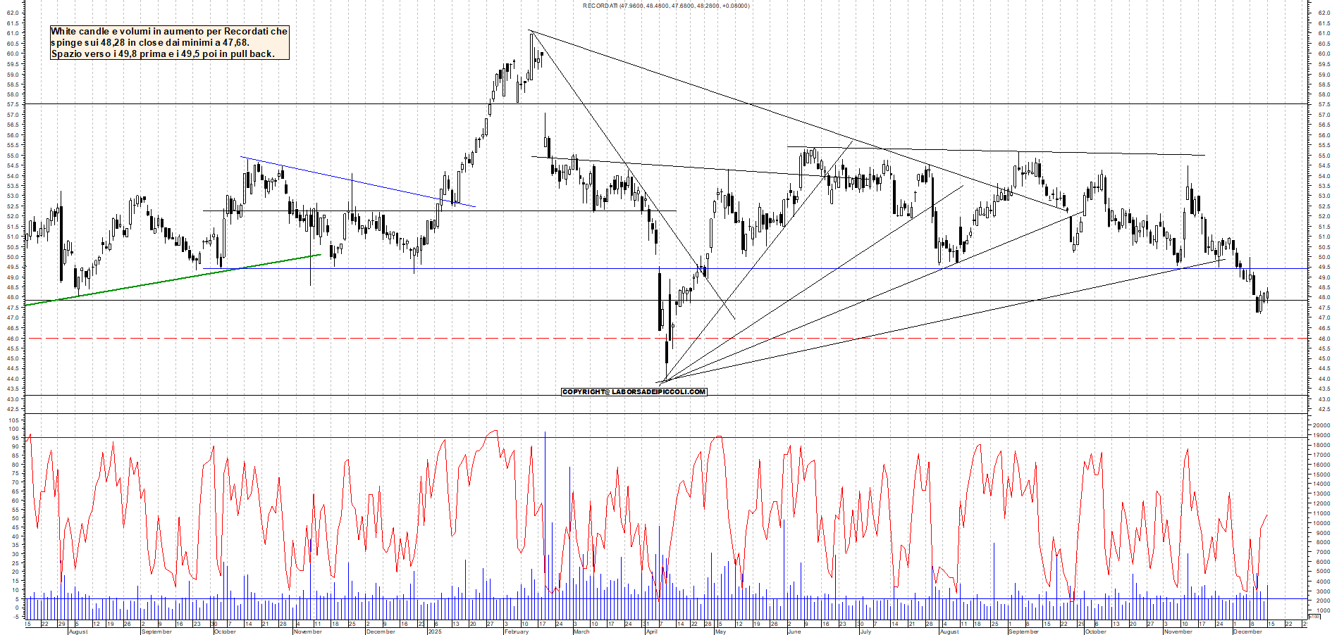 RECORDATI: White candle e volumi in aumento per Recordati che spinge sui 48,28 in close dai minimi a 47,68. Spazio verso i 48,8 prima e i 49,5 poi in pull back.