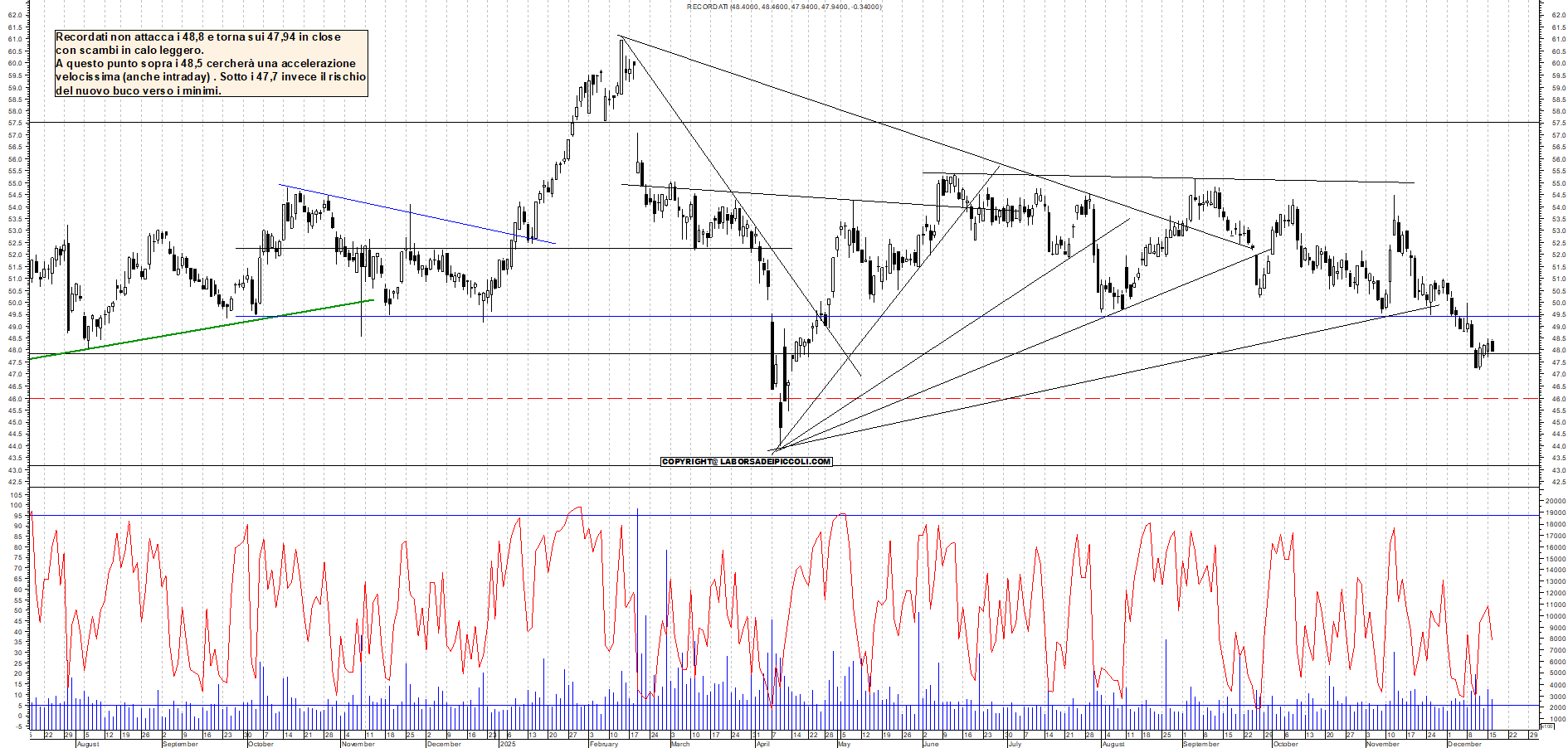 RECORDATI: Recordati non attacca i 48,8 e torna sui 47,94 in close con scambi in calo leggero. A questo punto sopra i 48,5 cercherà una accelerazione velocissima (anche intraday) . Sotto i 47,7 invece il rischio del nuovo buco verso i minimi.📊 Livelli OperativiSupporti:47,7->46€Resistenze:48,5->49,5€➔ Analisi completa RECORDATI con strategia operativa