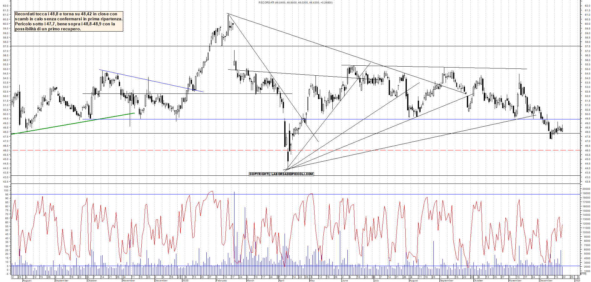 RECORDATI: Recordati tocca i 48,8 e torna su 48,42 in close con scamb in calo senza confermarsi in prima ripartenza. Pericolo sotto i 47,7, bene sopra i 48,8-48,9 con la possibilità di un primo recupero.
