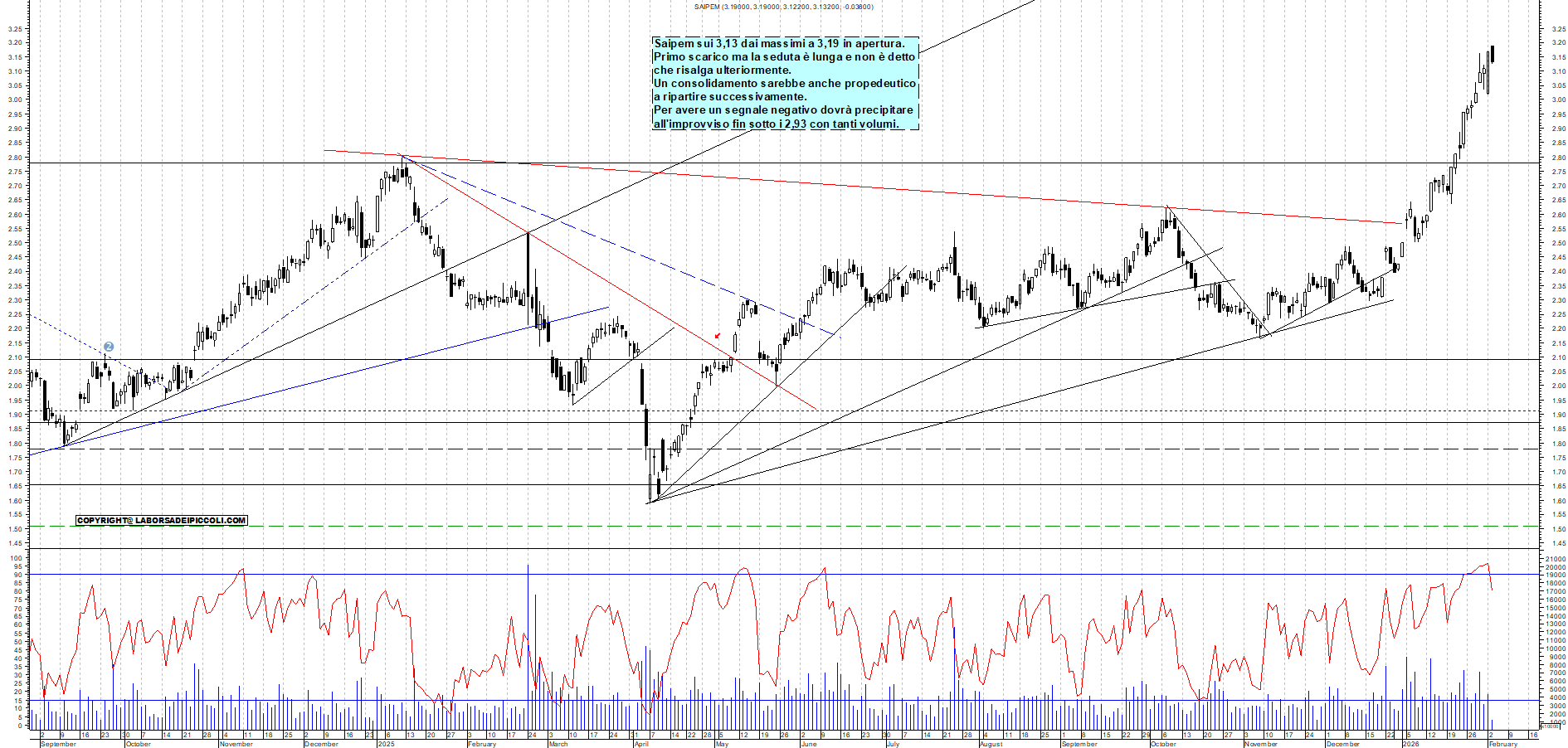 SAIPEM: Saipem sui 3,13 dai massimi a 3,19 in apertura. Primo scarico ma la seduta è lunga e non è detto che risalga ulteriormente. Un consolidamento sarebbe anche propedeutico a ripartire successivamente. Per avere un segnale negativo dovrà precipitare all'improvviso fin sotto i 2,93 con tanti volumi.