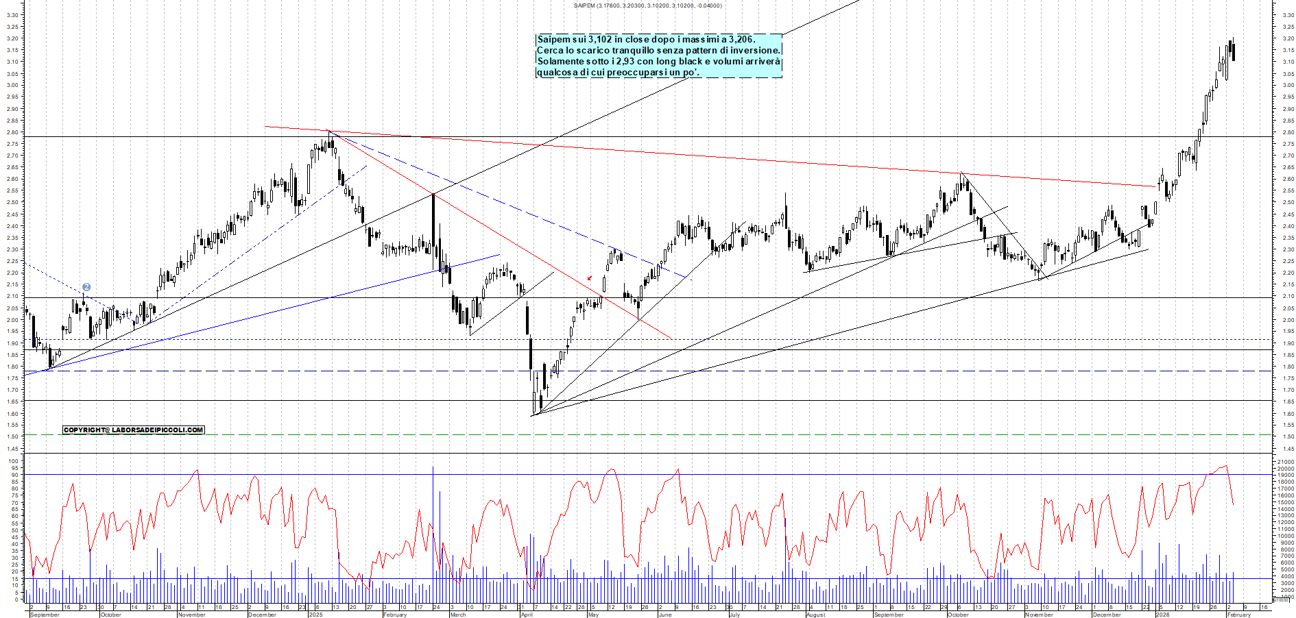 SAIPEM: Saipem sui 3,102 in close dopo i massimi a 3,206. Cerca lo scarico tranquillo senza pattern di inversione. Solamente sotto i 2,93 con long black e volumi arriverà qualcosa di cui preoccuparsi un po'.