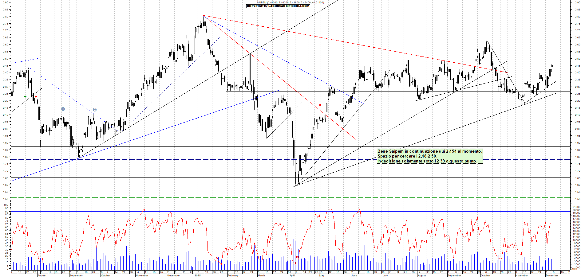 SAIPEM: Bene Saipem in continuazione sui 2,454 al momento. Spazio per cercare i 2,48-2,50. Indecisione solamente sotto i 2,39 a questo punto.