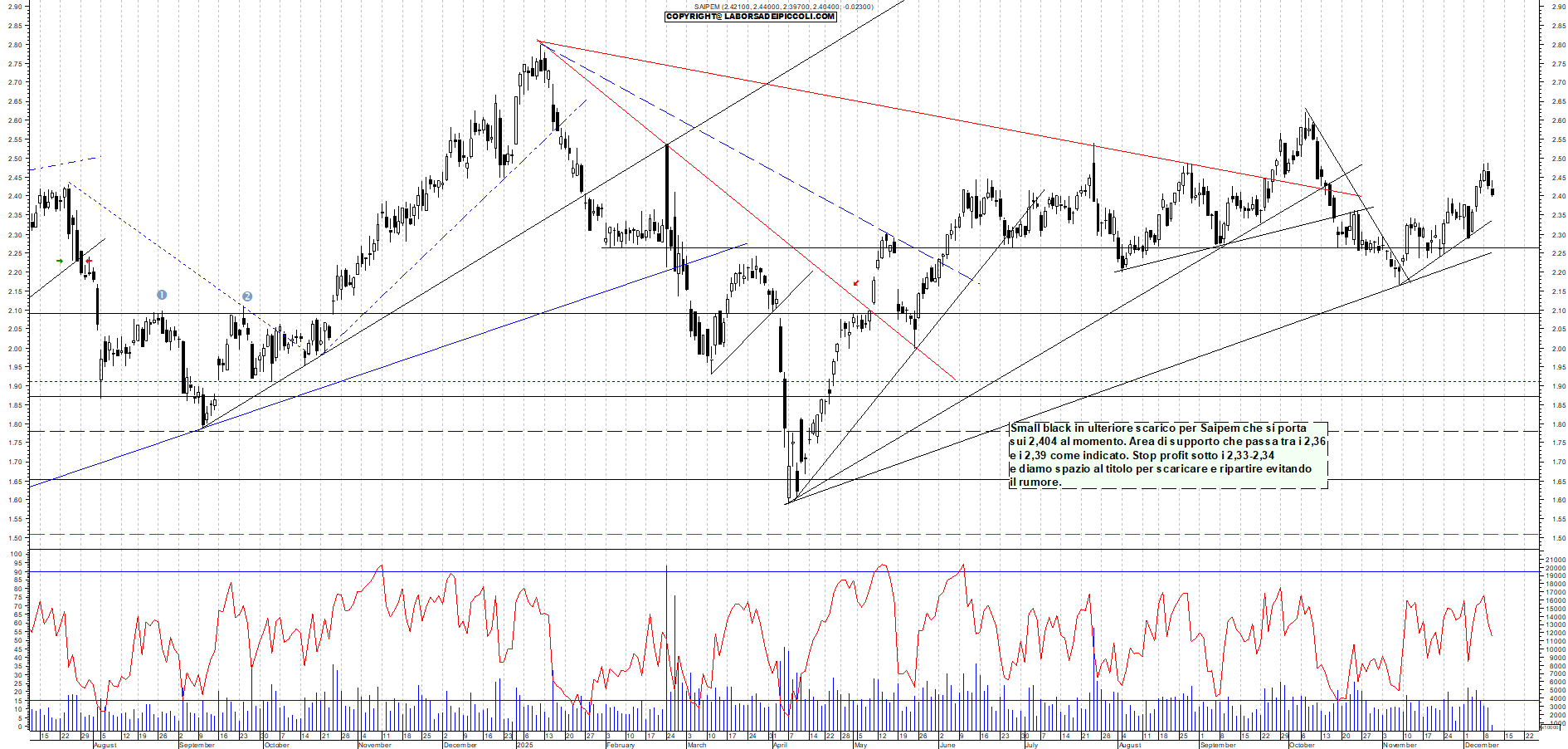 SAIPEM: Small black in ulteriore scarico per Saipem che si porta sui 2,404 al momento. Area di supporto che passa tra i 2,36 e i 2,39 come indicato. Stop profit sotto i 2,33-2,34 e diamo spazio al titolo per scaricare e ripartire evitando il rumore.