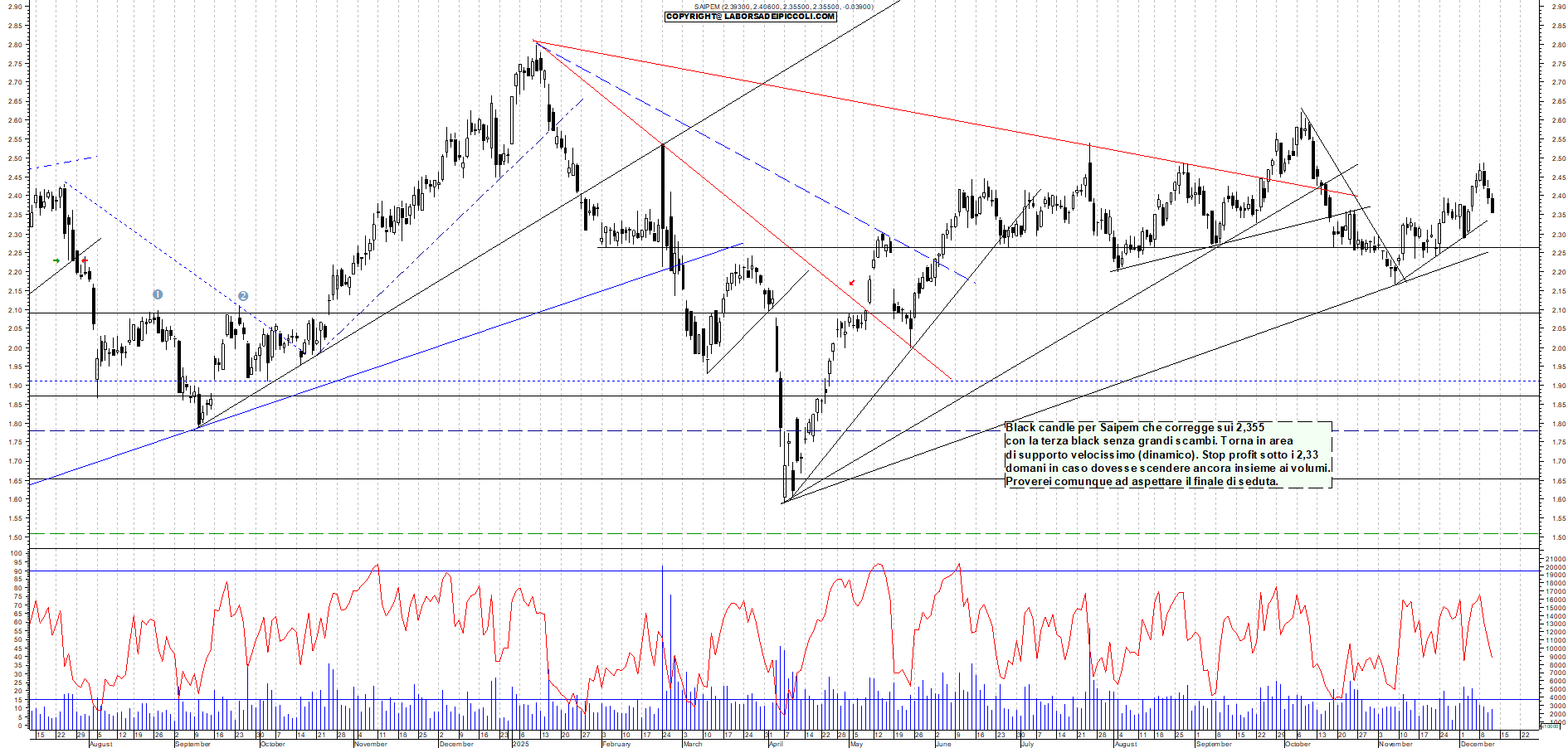 SAIPEM: Black candle per Saipem che corregge sui 2,355 con la terza black senza grandi scambi. Torna in area di supporto velocissimo (dinamico). Stop profit sotto i 2,33 domani in caso dovesse scendere ancora insieme ai volumi. Proverei comunque ad aspettare il finale di seduta.