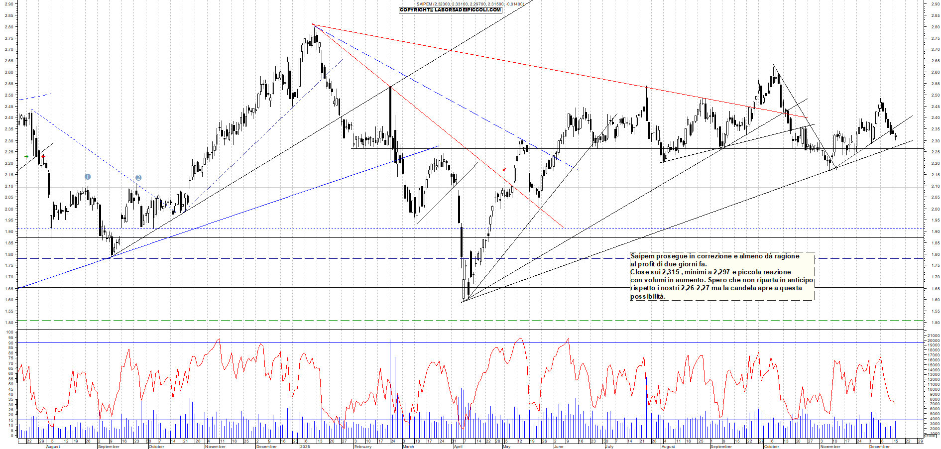 SAIPEM: Saipem prosegue in correzione e almeno dà ragione al profit di due giorni fa. Close sui 2,315 , minimi a 2,297 e piccola reazione con volumi in aumento. Spero che non riparta in anticipo rispetto i nostri 2,26-2,27 ma la candela apre a questa possibilità.