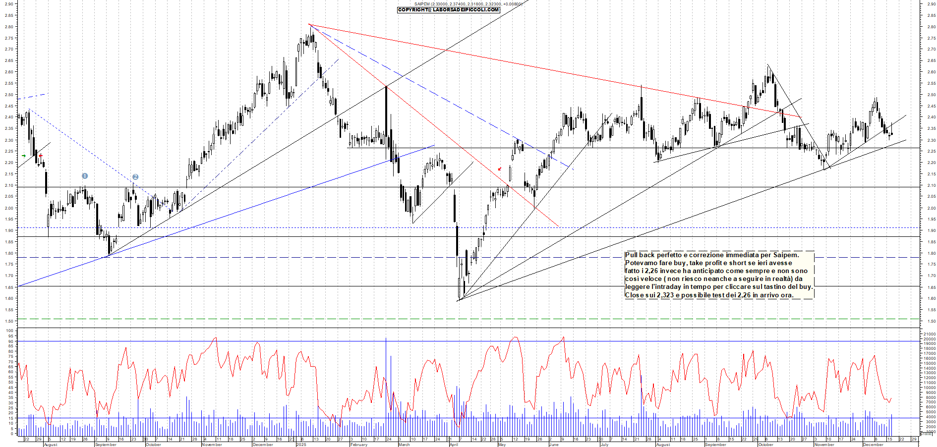 SAIPEM: Pull back perfetto e correzione immediata per Saipem. Potevamo fare buy, take profit e short se ieri avesse fatto i 2,26 invece ha anticipato come sempre e non sono così veloce ( non riesco neanche a seguire in realtà) da leggere l'intraday in tempo per cliccare sul tastino del buy. Close sui 2,323 e possibile test dei 2,26 in arrivo ora.