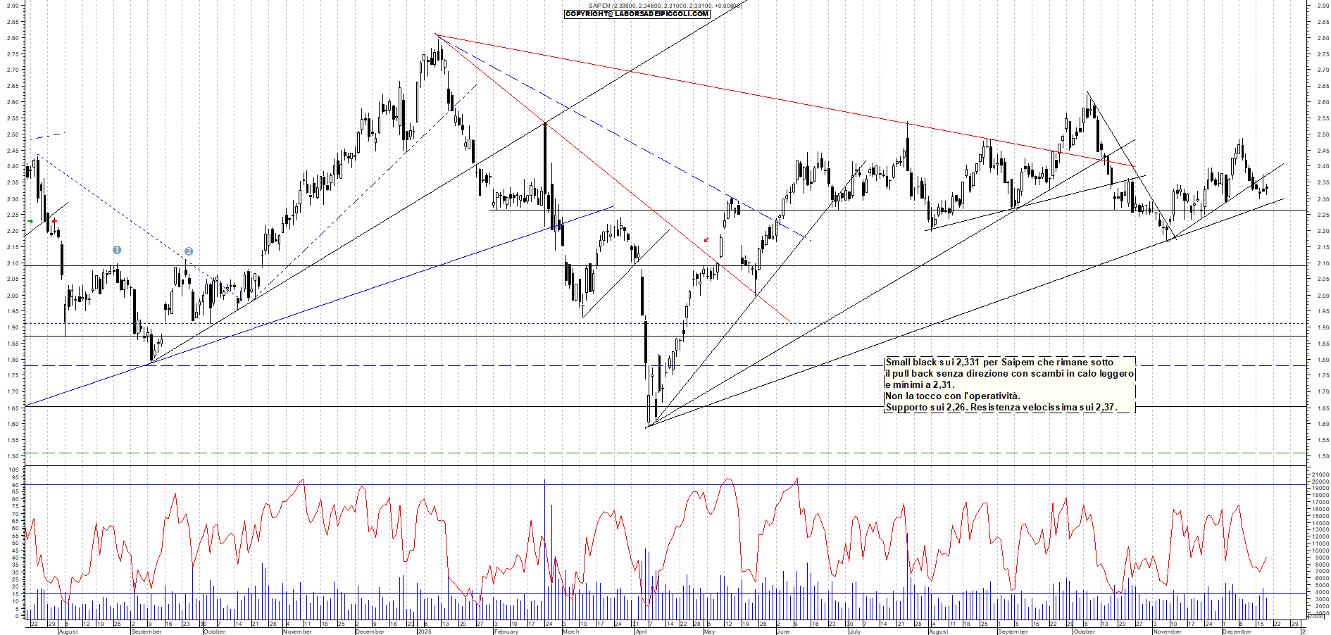 SAIPEM: Small black sui 2,331 per Saipem che rimane sotto il pull back senza direzione con scambi in calo leggero e minimi a 2,31. Non la tocco con l'operatività. Supporto sui 2,26. Resistenza velocissima sui 2,37.