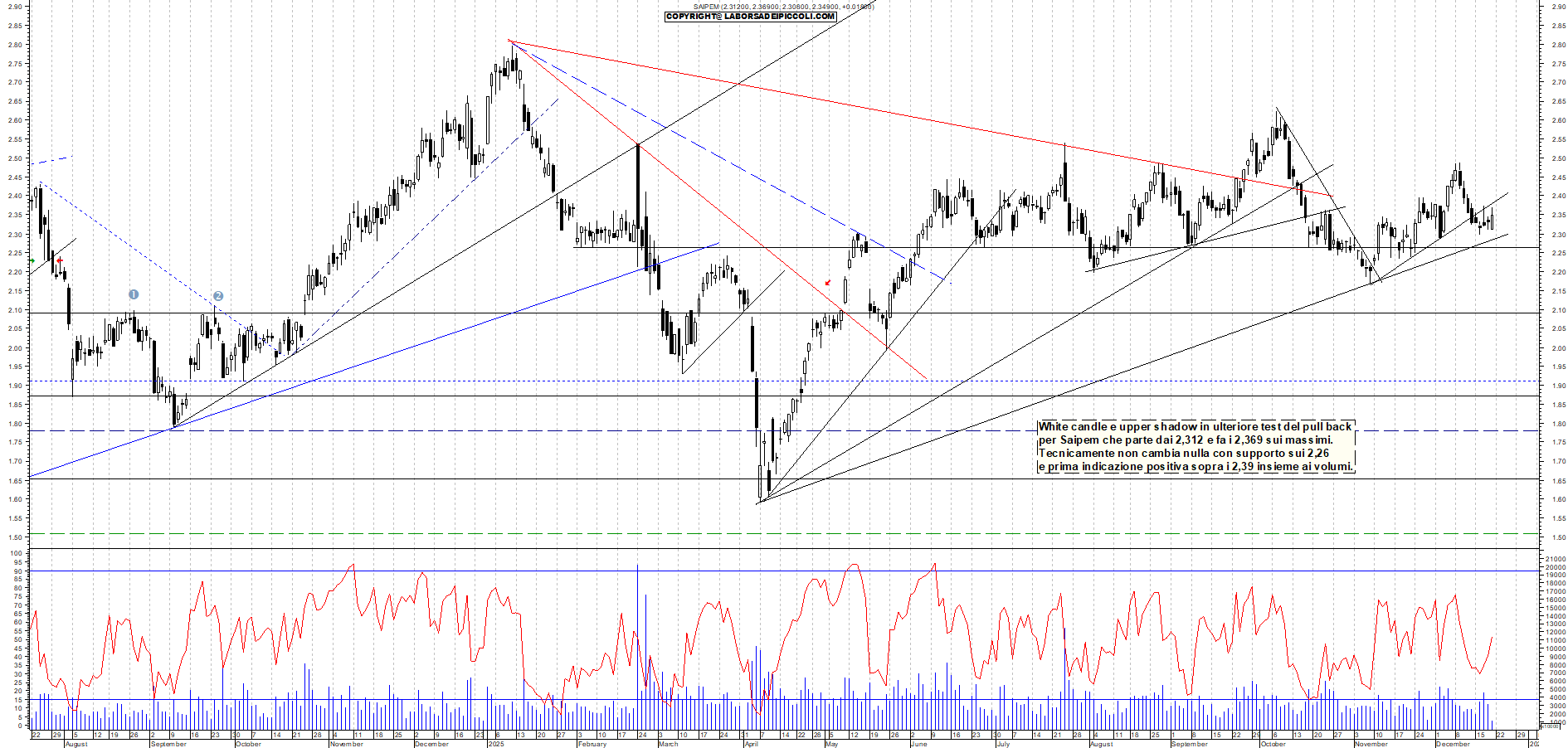 SAIPEM: White candle e upper shadow in ulteriore test del pull back per Saipem che parte dai 2,312 e fa i 2,369 sui massimi. Tecnicamente non cambia nulla con supporto sui 2,26 e prima indicazione positiva sopra i 2,39 insieme ai volumi.